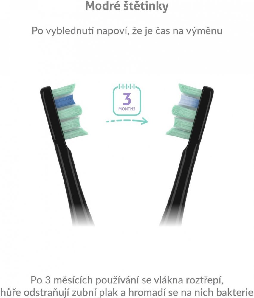 Hlavici kartáčku je třeba přibližně po 3 měsících vyměnit. To indikují modré štětinky, které postupně zbělají.