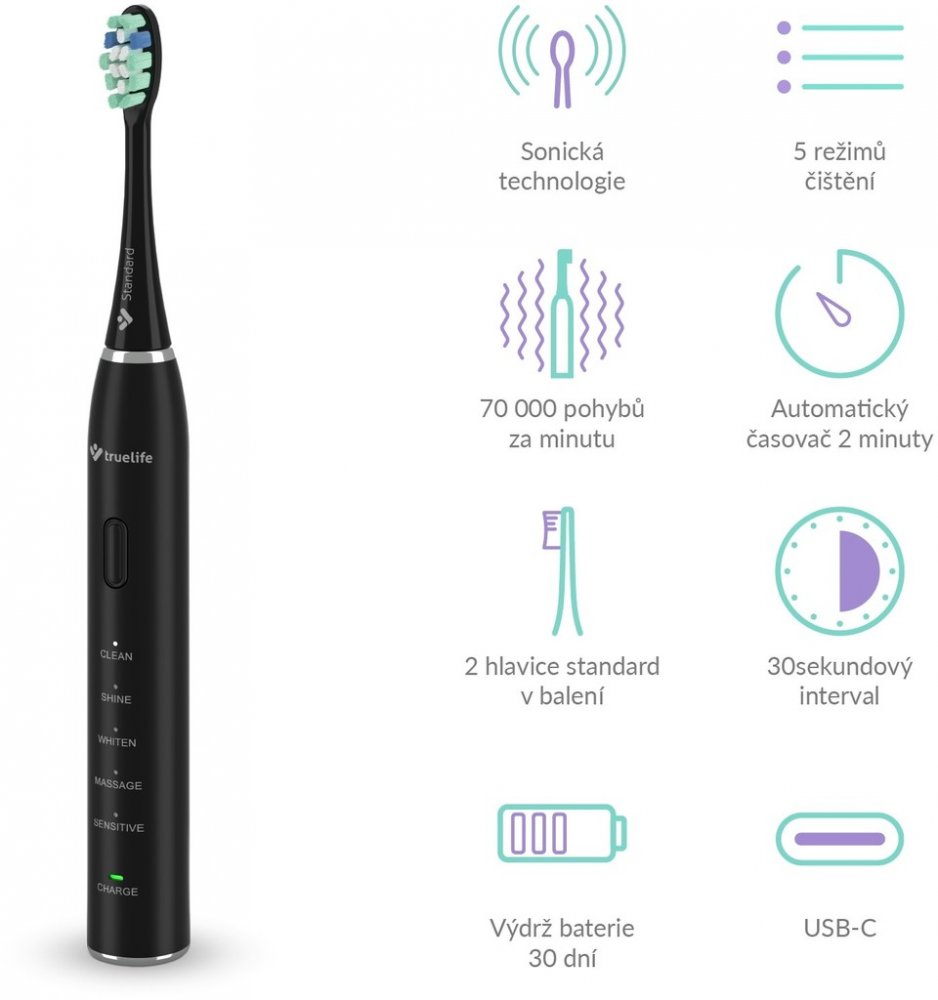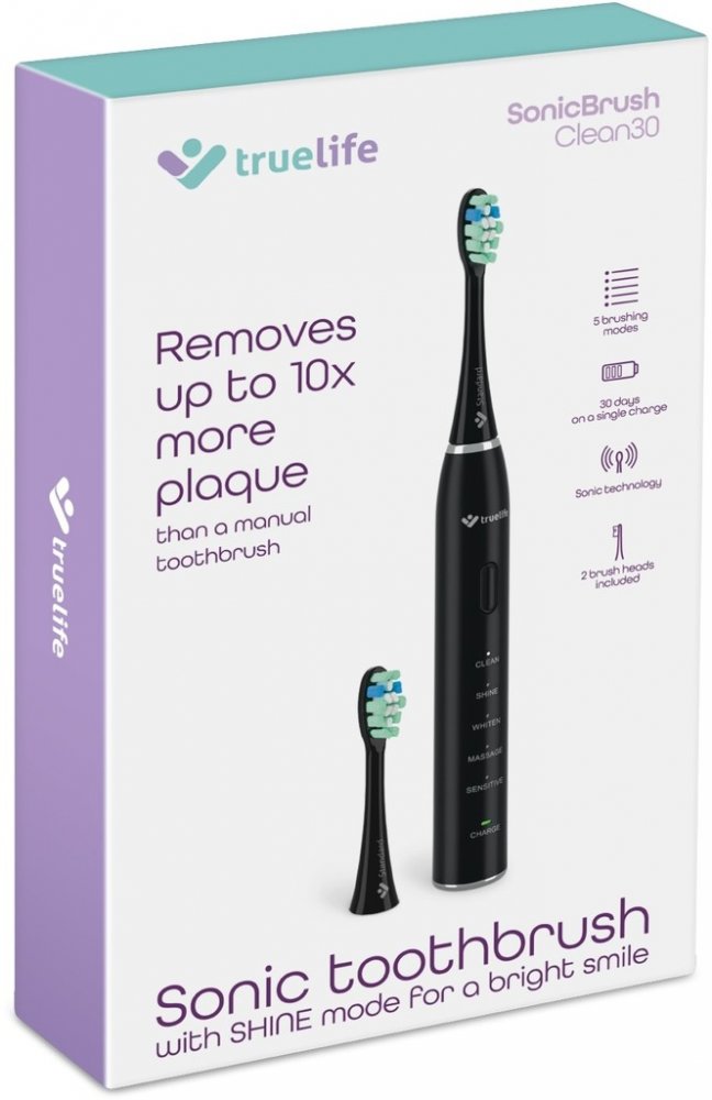 Krásný úsměv začíná správnou každodenní péčí o zuby. Skvělým cenově dostupným a výkonným pomocníkem je sonický kartáček TrueLife SonicBrush Clean30 se sonickou technologií SonicTrue®. Jeho 70 000 pohybů za minutu zuby dokonale vyčistí a jde i dál díky možnosti výběru z 5 režimů čištění. Clean vyčistí zuby a odstraní zubní plak, Shine zbaví zuby skvrn od čaje a kávy, k vybělení slouží režim Whiten, dásním udělá dobře Massage a pro citlivé zuby a dásně je určen režim Sensitive. Balení obsahuje 2 hlavice Standard, jejichž modré štětinky zhruba po třech měsících zbělají. Tím indikují, že je potřeba hlavici vyměnit. Na jedno nabití vydrží kartáček 30 dní, pak ho jen stačí dobít pomocí přiloženého USB-C kabelu.