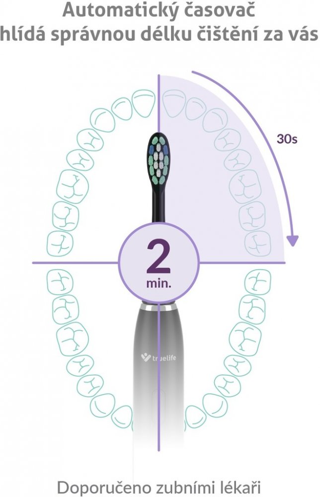 2minutový interval čištění je rozdělen do 4 sekcí. Po každých 30 sekundách nastane krátké přerušení, které upozorní, že je čas přesunout se k čištění další části chrupu.