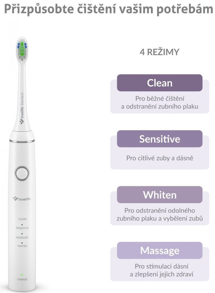 Pro každé použití a pro růžné potřeby vašich zubů je kartáček vybaven hned 4 režimy čištění. Clean - vhodný pro každodenní čištění, Sensitive - jemnější k citlivým zubům a dáním, Massage - pro příjemnou masáž dásní, Whiten - pro odstraňování pigmentace ze zubů.
