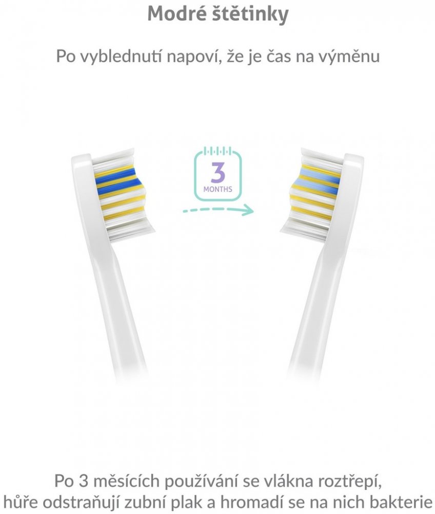 Hlavice disponují modrými štětinkami, které indikují míru opotřebení. Snadno poznáte, že je načase hlavici vyměnit.