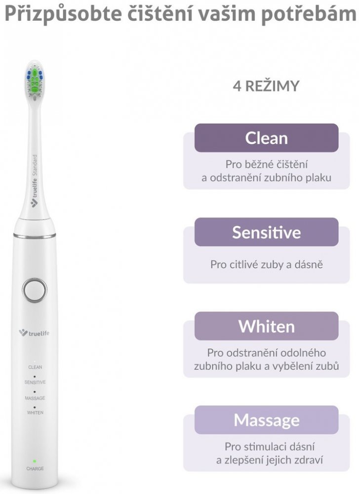 Kartáčky ze sady TrueLife SonicBrush Compact Duo nabízejí 4 režimy čištění, které se komplexně postarají o vaše ústa. Režim Clean je nejběžnější a hodí se pro každodenní používání. Citlivé zuby a dásně můžete s klidem svěřit režimu Sensitive. Ke krásnému bílému úsměvu vám pomůže režim Whiten a příjemnou masáž dásní zajistí režim Massage.