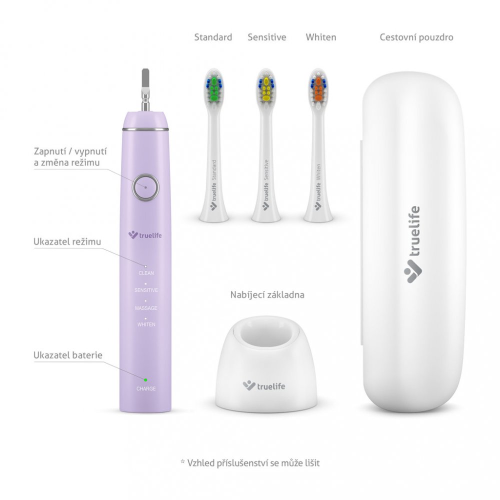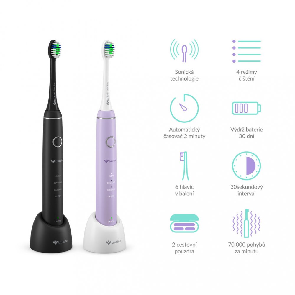 Perfektní výsledek v péči o zuby v pohodlí domova spolehlivě zařídí sonický elektrický zubní kartáček TrueLife. Manipulace je naprosto komfortní, stačí jej lehce přiložit. Díky rychlosti 70000 pohybů za minutu zlikviduje veškeré nečistoty a vám zbyde jen viditelně bělejší úsměv. Profesionální hlava kartáčku bez námahy vyčistí hůře dostupná místa kvalitněji než ruční kartáček. Elektrický kartáček T...