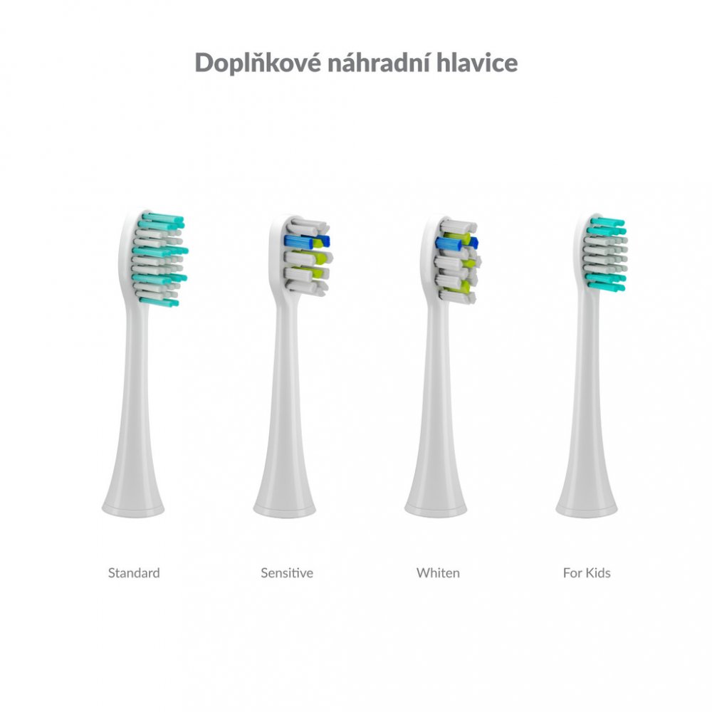 Součástí balení jsou 3 náhradní hlavice různých typů – Standard pro běžné čištění, Sensitive pro citlivější zuby a Whiten pro bělící efekt.
