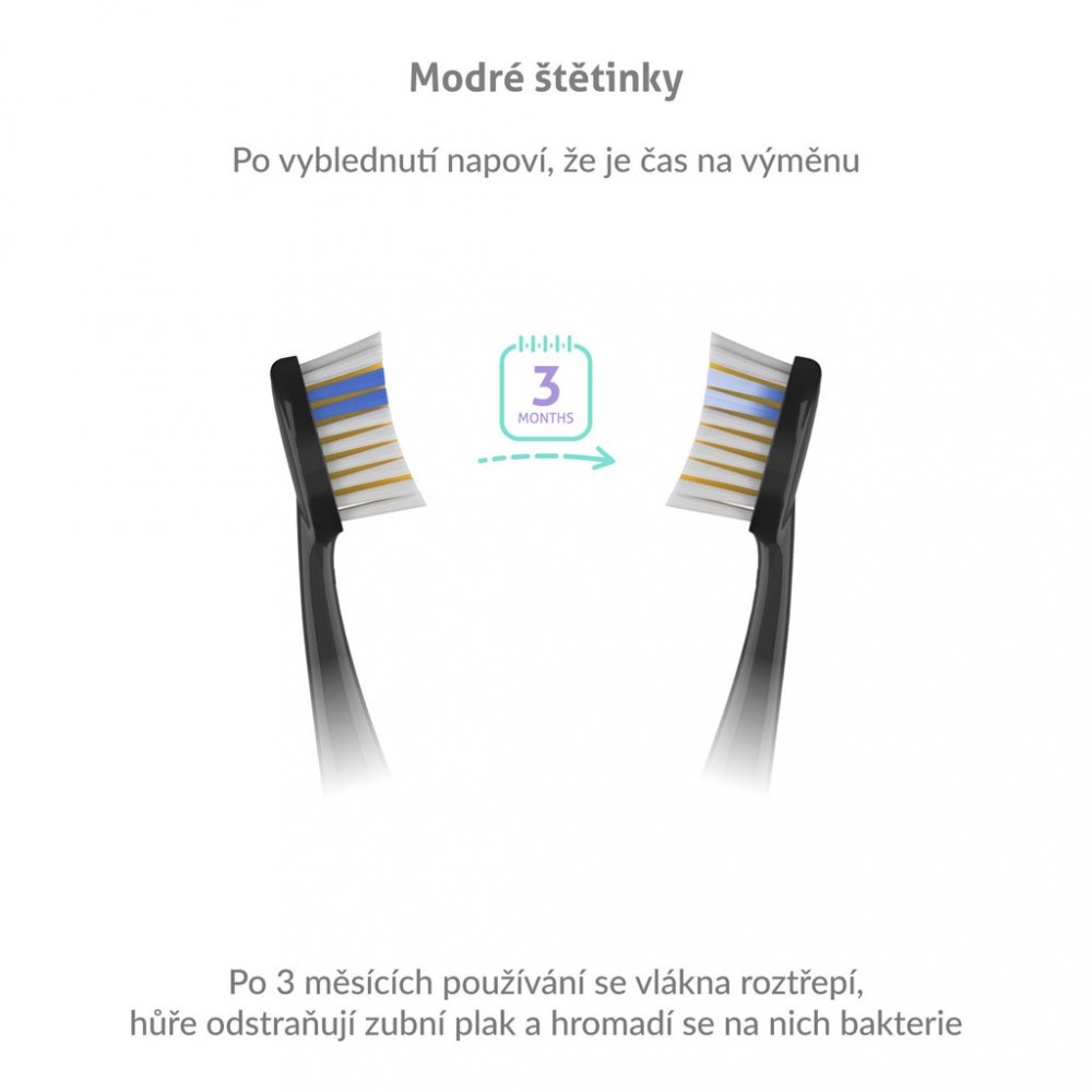 Hlavice disponují modrými štětinkami, které indikují míru opotřebení. Snadno poznáte, že je načase hlavici vyměnit.
