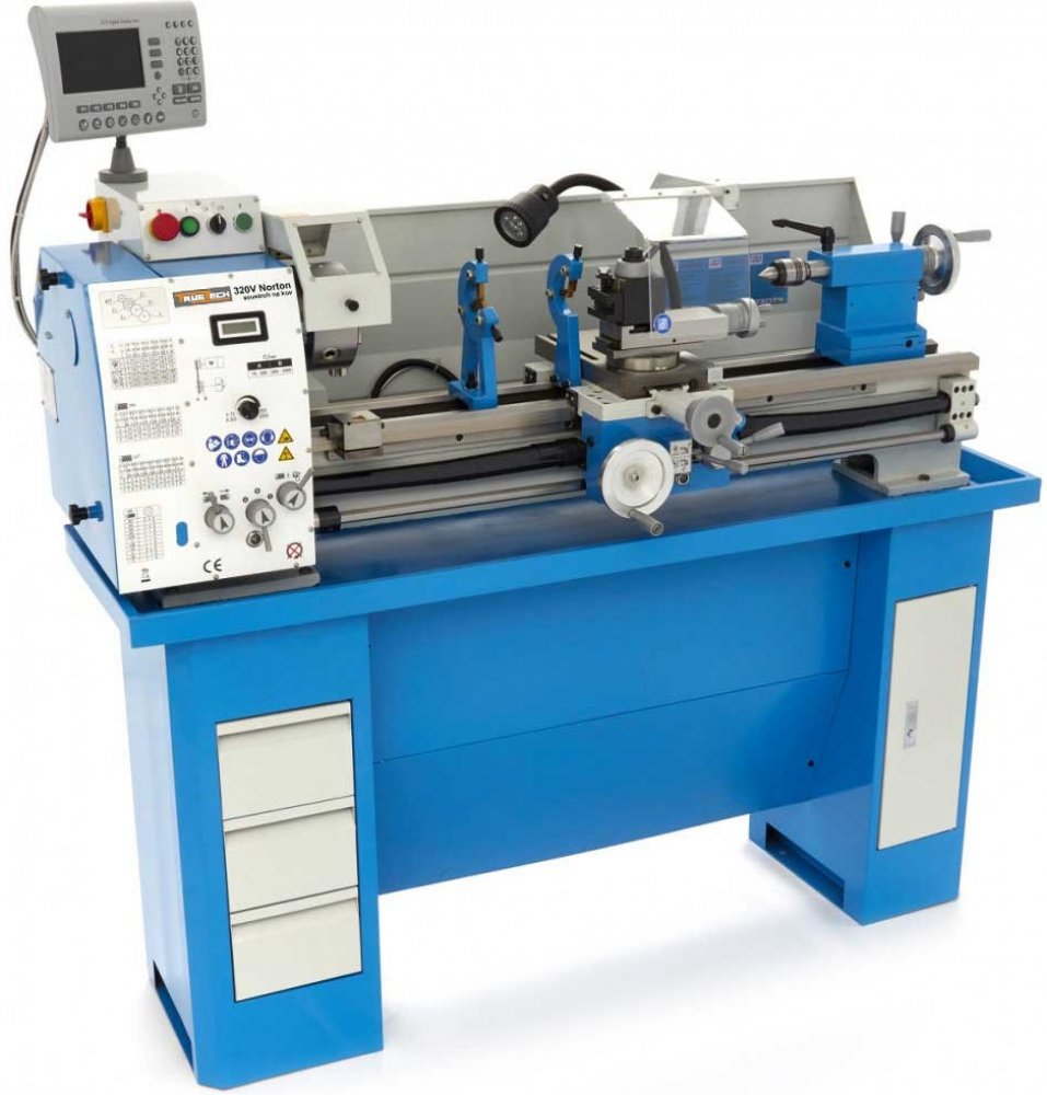 TrueTech 320V Norton DRO, soustruh na kov s podstavcem, vario otáčky řízené invertorem, převodovka posuvů, optické digitální odměřování s LCD, plně vybavený, 1.5 kWKvalitně postavený soustruh s výkonným asynchronním motorem, frekvenčním měničem zajišťujícím plynulou změnu otáček a v neposlení řadě převodovkou pro změnu rychlostí podélného a příčného posuvu. Soustruh je kompletně vybaven včetně po...