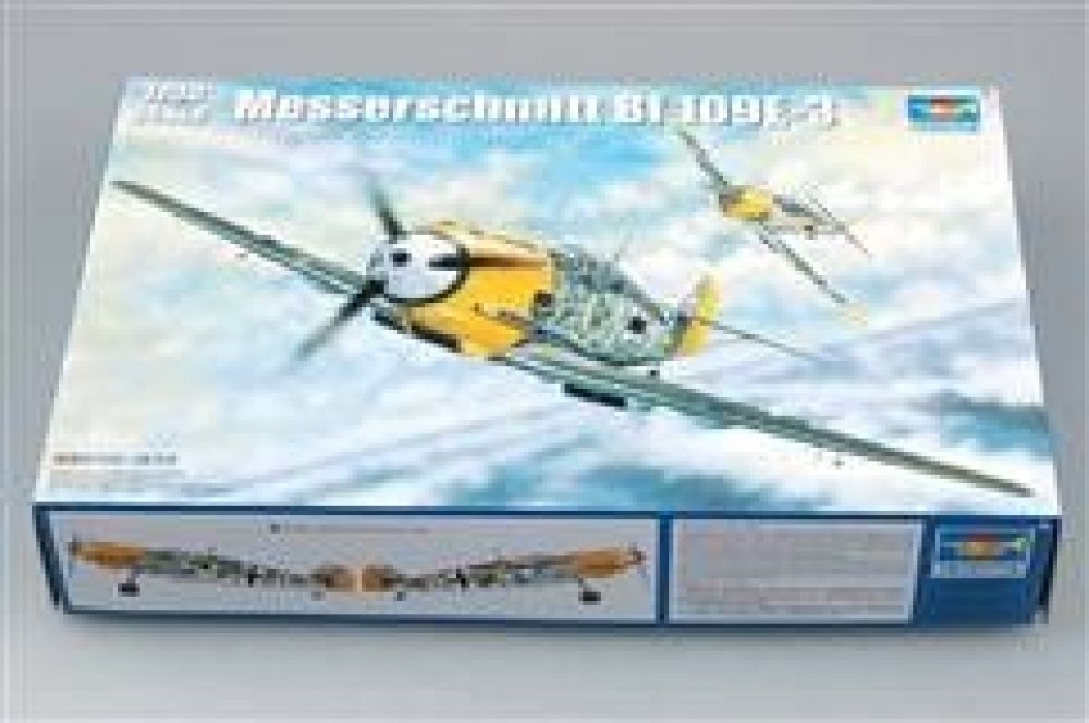 Slepovací plastikový model německého stíhacího letadla Messerschmitt Bf 109E-3. Od výrobce modelů, firmy Trumpeter.