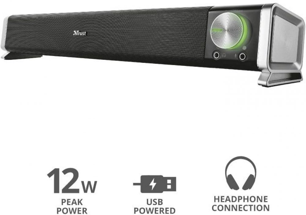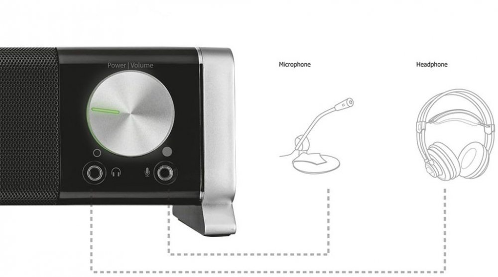 * Bohatý stereo zvuk z kompaktního reproduktoru, který lze umístit pod jakýkoliv počítačový monitor.