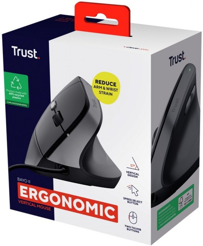 Trust Bayo IIZískejte více radosti ze svého pracovního dne s Bayo II. Tato myš s optimálním úhlem 57 stupňů byla ergonomicky navržena tak, aby vaše paže a zápěstí byly v nejpohodlnější, přirozené poloze pro šťastnější práci.Pohybujte se přesně díky tlačítku pro výběr rychlosti této myši. Díky možnosti přepínat mezi 800–2400 DPI upravte rychlost kurzoru tak, aby co nejlépe vyhovovala jakékoli úloze...