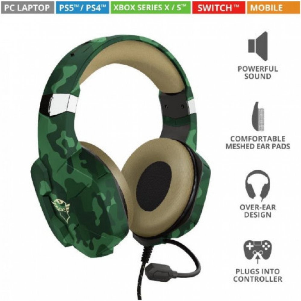 Trust GXT 323C Carus Gaming Headset - jungle camo. Síťovaná polstrovaná herní sluchátka s flexibilním mikrofonem a výkonnými basy určená pro PC a konzoly. Podívejte se na situaci, poslouchejte, co říkají vaši spoluhráči, a udělejte vítězná rozhodnutí. S Trust GXT 323C Carus uslyšíte, co je důležité, a ostatní uslyší každý váš příkaz. Velké, pohodlné náušníky jsou vyrobeny ze síťovaných materiálů, ...