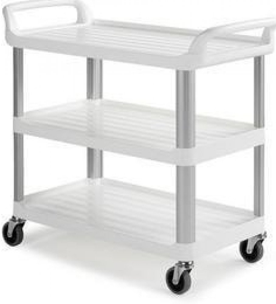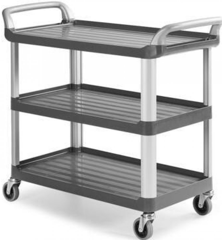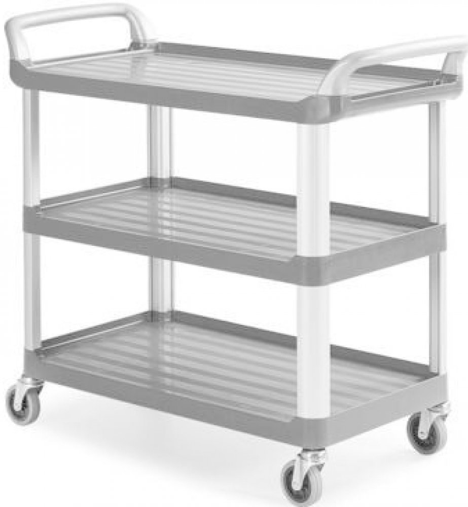 Policový vozík se dvěma madly v rozměru (v x š x h) 111 x 98 x 50 cm a s nosností 150 Kg. Disponuje třemi policemi s hranou o výšce 2,4 cm. Police jsou v rozměru (d x š) 89 x 49.Konstrukce vozíku je vyrobena z hliníku a police jsou zhotoveny z polypropylenu v barvě šedé. Plast je vybaven protiskluzovým povrchem. Čtyři gumová otočná kola, o průměru 100 mm. Pro snadnou manipulaci je vozík opatřen pr...