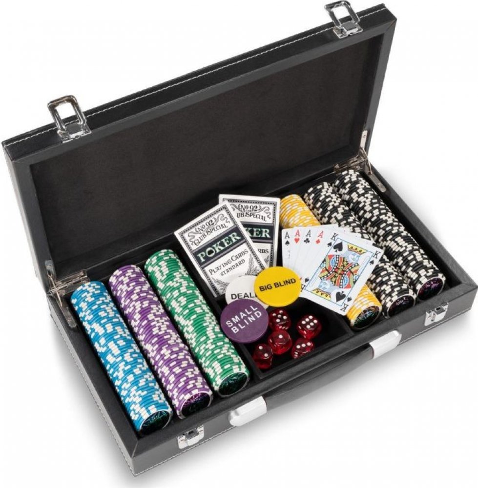 Herní sada obsahuje 1x kožené pouzdro se 2 přezkami a rukojetí z tvrdé gumy, 300 žetonů, 2x balíček karet, 5x hrací kostku, 1x dealerské tlačítko, 1x malý blind, 1x velký blind, 1x německý návod ke hře.