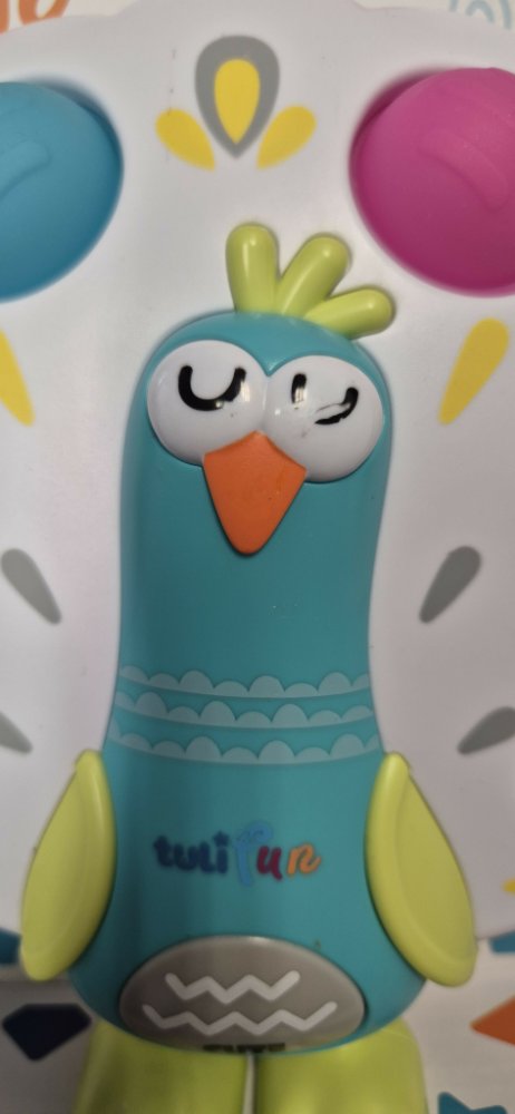 Senzorická hračka ve tvaru páva, která zapojuje smysly dítěte prostřednictvím různých aktivit: vtlačování barevných kuliček, otáčení chrastících prvků a stisknutí pískátka v bříšku. Čtyři barevné kuličky na vtlačování zdobí různorodé vzory a dvě průhledné, otočné kuličky plní funkci chrastítek. Hračka podporuje rozvoj jemné motoriky, koordinaci ruka-oko a stimuluje smysly dotyku a sluchu. Vlastnosti produktu: