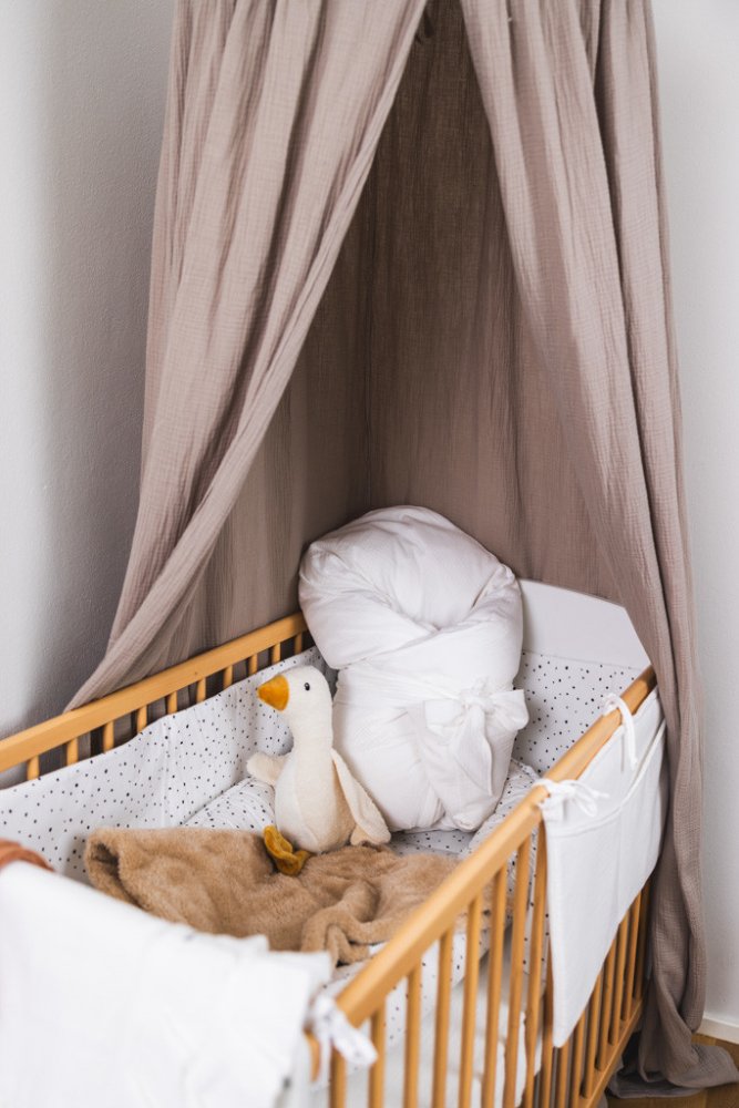 Mušelínový baldachýn je skvělý doplněk každé dětské postýlky. Nejde jen o designový prvek, jde o příjemné a nerušené prostředí pro klidný spánek. Zajistí pocit bezpečí a jistoty kolem hlavičky miminka. Omezí okolní světlo, hluk i případný průvan. Baldachýn lze zavěsit na strop nebo na pomocný kovový stojan. Baldachýn lze následně použít k vytvoření malého doupěte v dětském koutku nebo na zahradě.
