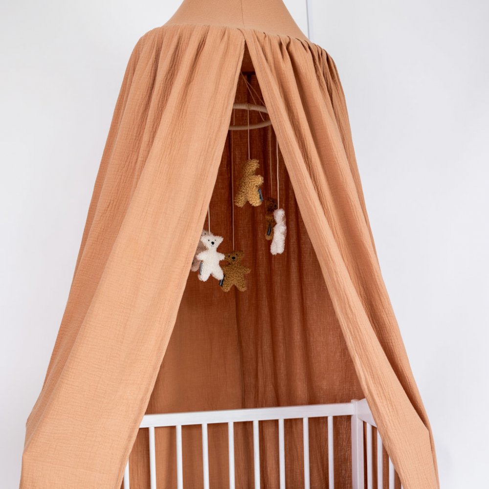 Mušelínový baldachýn je skvělý doplněk každé dětské postýlky. Nejde jen o designový prvek, jde o příjemné a nerušené prostředí pro klidný spánek. Zajistí pocit bezpečí a jistoty kolem hlavičky miminka. Omezí okolní světlo, hluk i případný průvan. Baldachýn lze zavěsit na strop nebo na pomocný kovový stojan. Baldachýn lze následně použít k vytvoření malého doupěte v dětském koutku nebo na zahradě.