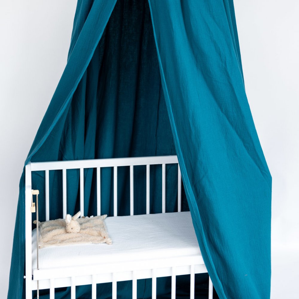 Mušelínový baldachýn je skvělý doplněk každé dětské postýlky. Nejde jen o designový prvek, jde o příjemné a nerušené prostředí pro klidný spánek. Zajistí pocit bezpečí a jistoty kolem hlavičky miminka. Omezí okolní světlo, hluk i případný průvan. Baldachýn lze zavěsit na strop nebo na pomocný kovový stojan. Baldachýn lze následně použít k vytvoření malého doupěte v dětském koutku nebo na zahradě.