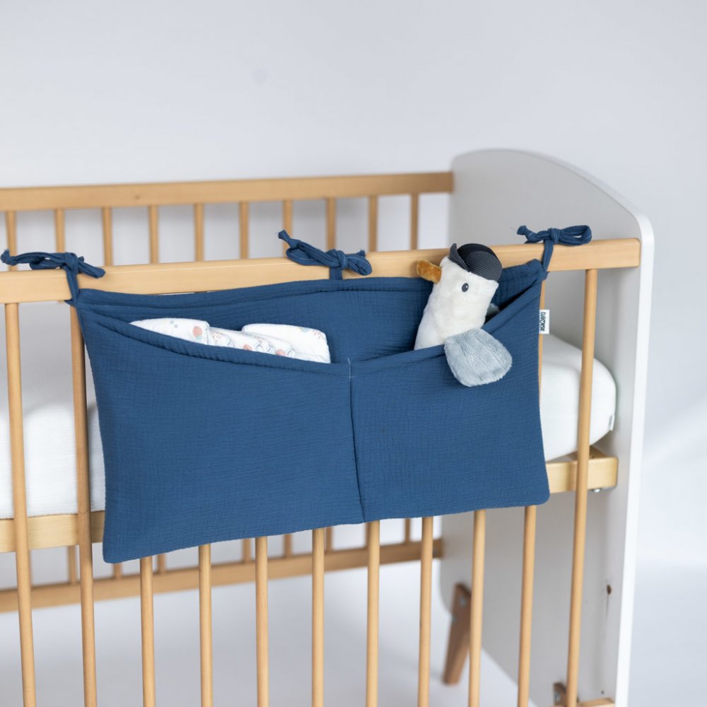 Praktický mušelínový kapsář v modré barvě. Kapsář je opatřen třemi tkanicemi. Je možné ho připevnit na postýlku pro miminko i na větší postel s dřevěnými bočnicemi. Kapsář je zpevněn vatelínovou výplní, kapsy dobře drží tvar a jsou velmi praktické na úschovu několika plenek, krémů, hraček, oblečení nebo knih.