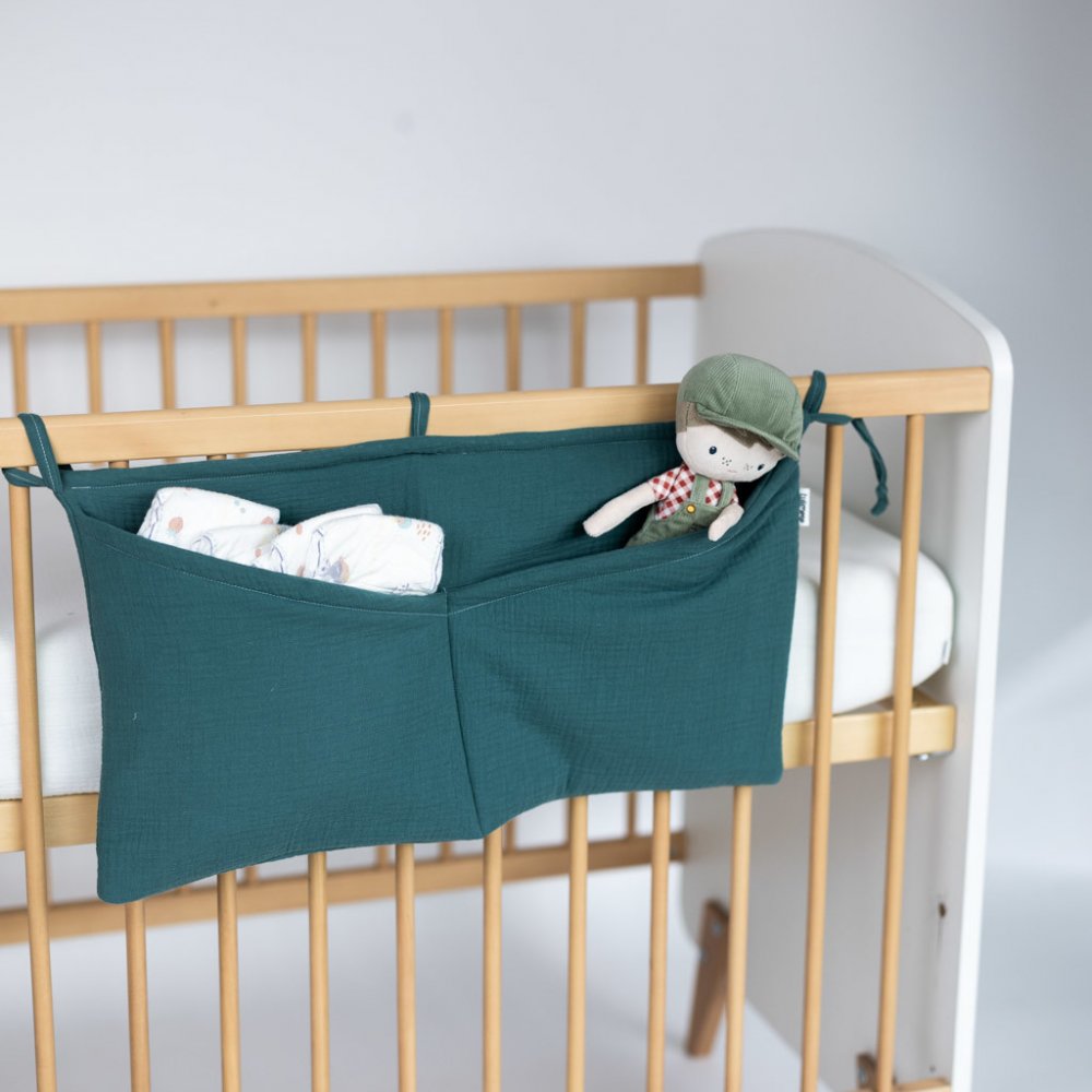 Praktický mušelínový kapsář s možností vlastní výšivky. Kapsář je opatřen třemi tkanicemi. Je možné ho připevnit na postýlku pro miminko i na větší postel s dřevěnými bočnicemi. Kapsář je zpevněn vatelínovou výplní, kapsy dobře drží tvar a jsou velmi praktické na úschovu několika plenek, krémů, hraček, oblečení nebo knih. Kapsář je vhodný pro malé i velké.