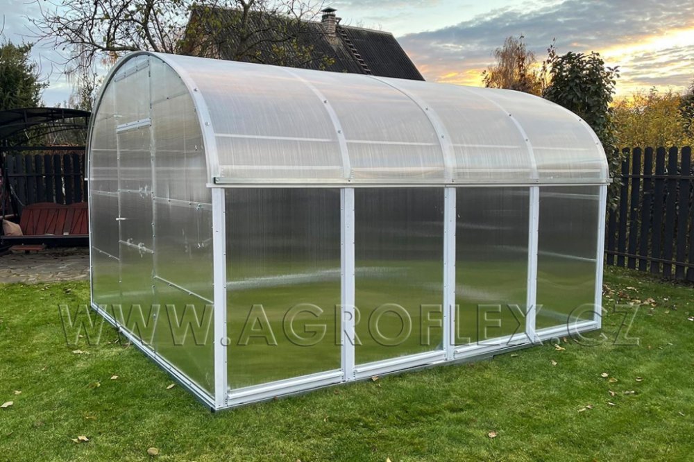 Celoroční horský zahradní skleník z polykarbonátu s kombinací rovných stěn a obloukové střechy TULIPAN L35H ma systém bočního otevírání.