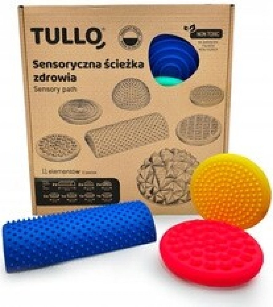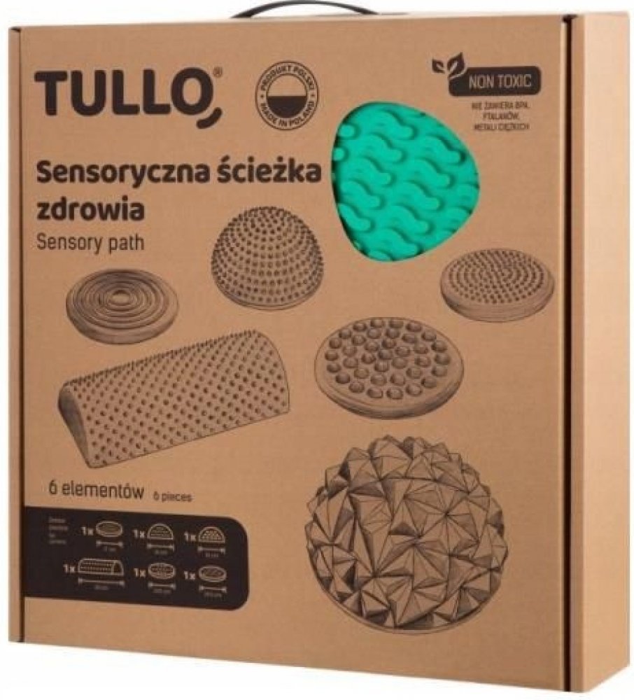 Smyslová dráha je určena pro cvičení rovnováhy, nápravu špatného držení těla a masáž chodidel. Velmi dobře funguje při hře s dětmi, zatraktivňuje skupinové aktivity. Speciální kónické hroty a výstupky stimulují smyslové receptory a zlepšují krevní oběh.Skvělá zábava pro celou rodinu. Možnost libovolného uspořádání prvků podporuje dětskou kreativitu. Obsahuje 11 prvků, včetně dvě smyslové polokoule dvě smyslové polokoule ve tvaru diamantu 5 smyslových disků dvě smyslové polokoule Výrobky Tullo jsou bezpečné: jsou vyrobeny výhradně v Polsku z certifikovaných surovin nejvyšší kvality neobsahují ftaláty, BPA, těžké kovy Velikost: Polokoule - průměr 16 cm, Disky - průměr 17 cmPůlválce - délka 30 cm x šířka 12 cm Smyslová dráha sestávající z 11 prvků (z nichž některé se opakují). Hračka je vyrobena z netoxické, vysoce kvalitní gumy. Každý dílek se vyznačuje nejen odlišnou barvou, ale také tvarem a reliéfní strukturou. Ty mohou být různé, od hrotů přes vlnky, bubliny až po nepravidelné hrboly. Výrobek je ideální pro všechny druhy rehabilitace. Rozvíjí také hmat dítěte a stimuluje jeho smyslové receptory. Díky tomu, že sada obsahuje takovou škálu prvků, je možné vytvářet různé způsoby hraní. rozměry balení: rozměry balení: 38x10x40 cm Smyslové kuličky Tullo neobsahují polyethylen, BPA ani těžké kovy. Jsou kompletně vyráběny v Polsku z nejkvalitnějších certifikovaných surovin - 3 díly senzorických míčků Tullo ideální pro lázně a cvičení. Různé textury povrchu a barvy rozvíjejí integraci hmat-oko. Velmi dobře funguje při hře s dětmi, stává se atraktivnější.