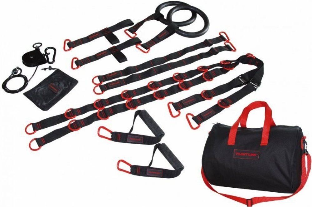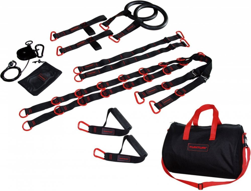 Tunturi Cross Fit Trainer. Profesionální a velmi efektivní systém posilování proti vlastní hmotnosti. Systém se skládá z popruhů, které lze snadno uchytit do dveří, na strom, či jiný opěrný bod. Konce úchytů jsou opatřeny měkkými úchopy pro ruce a nohy. 2 samostatné hlavní popruhy, kladka a D-ring adaptéry nabízí mnohem více variant cvičení než klasický suspension trainer.?