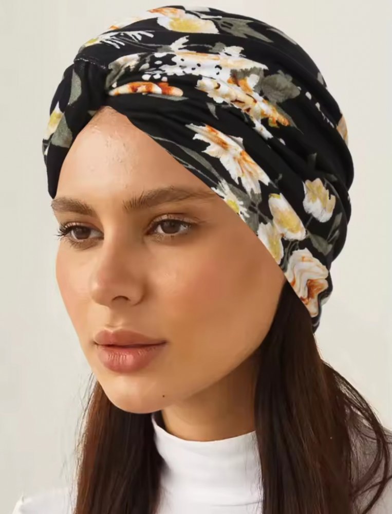 turban na hlavu černý s květinami