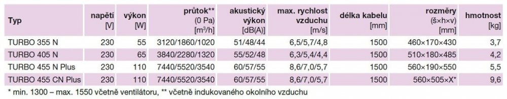 Ventilátory jsou vhodné pro větrání výrobních hal, sléváren, kováren, sušáren, strojoven, stavenišť, skleníků a chovných stanic. Ventilátory splňují IEC 60879. SkříňSkříň je z ocelových kruhových profilů, galvanicky pokovených, provedení chrom. Skříň je vybavena ochrannou mřížkou podle EN 60335-1 a EN 60335-2-80 a je namontována na stojanu z ocelových trubek. Skříň je možno po povolení matic natáčet podle potřeby směrování proudu vzduchu. TURBO CN má dlouhý nastavitelný stojan o celkové délce včetně ventilátoru 1300–1550 mm. Oběžné koloOběžné kolo je z ocelového plechu, tvar „SICKLE“ je speciálně optimalizovaný z hlediska maximálního průtoku a tlaku při minimální hlučnosti. MotorMotor je asynchronní s kotvou nakrátko, vnějším rotorem a rozběhovým kondenzátorem. Kuličková ložiska s tukovou náplní na dobu životnosti. Motor je dynamicky vyvážen dle ISO 1940 a obsahuje tepelnou ochranu. Krytí IPX0. Směr otáčeníSměr otáčení není možno měnit. Průtok vzduchu od oběžného kola k motoru. SvorkovniceSvorkovnice je součástí ventilátoru a je umístěna na motoru. Regulace otáčekRegulace otáček se provádí třístupňově, regulace a vypínač je součástí ventilátoru. HlukHluk emitovaný ventilátorem je uveden v tabulce. MontážMontáž ventilátoru v každé poloze osy motoru. Ventilátor lze postavit na pracovišti na libovolný pevný základ. PokynyVentilátory jsou vhodné pro větrání výrobních hal, sléváren, kováren, sušáren, strojoven, stavenišť, skleníků a chovných stanic. Ventilátory splňují IEC 60879.