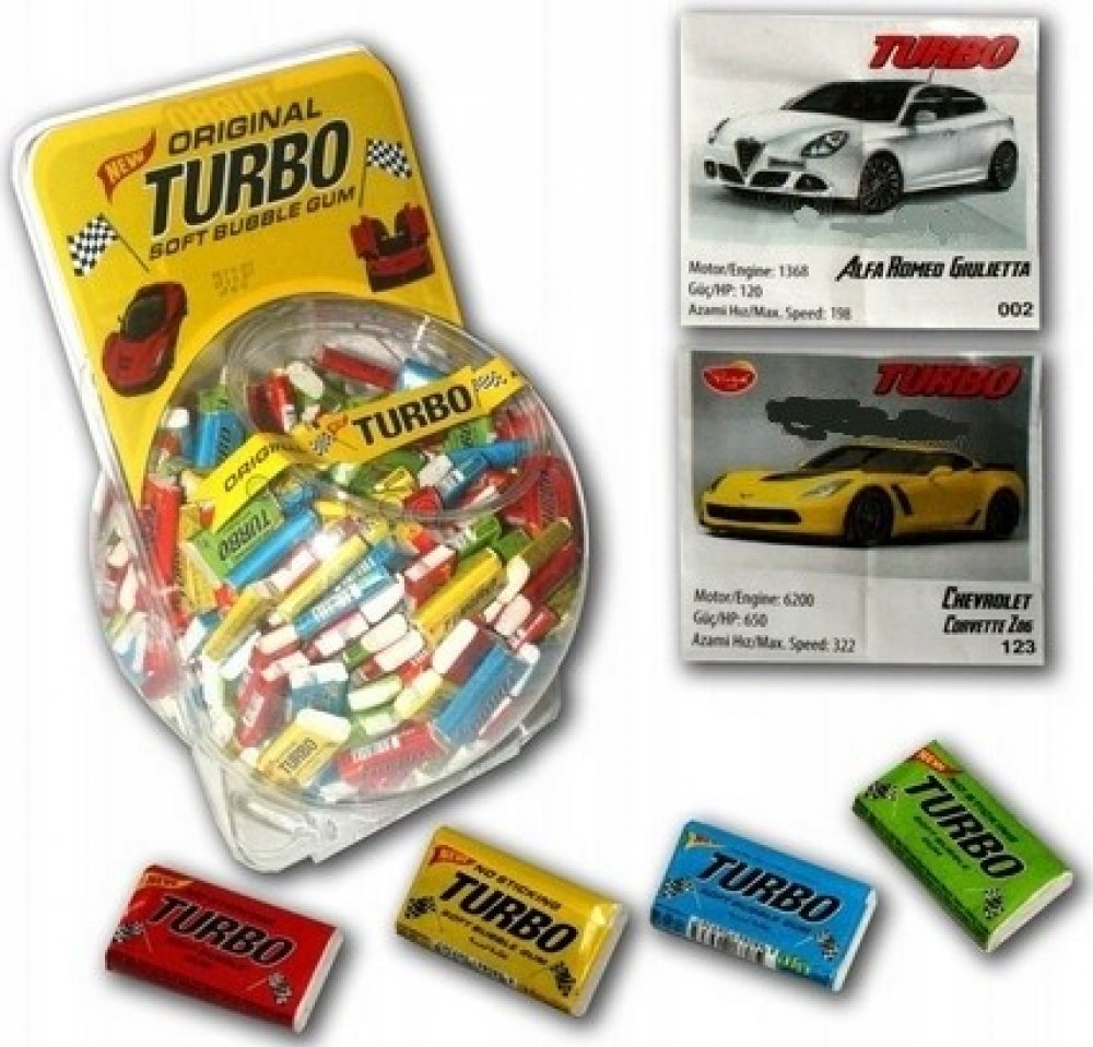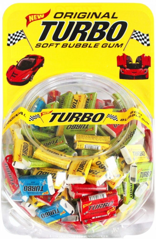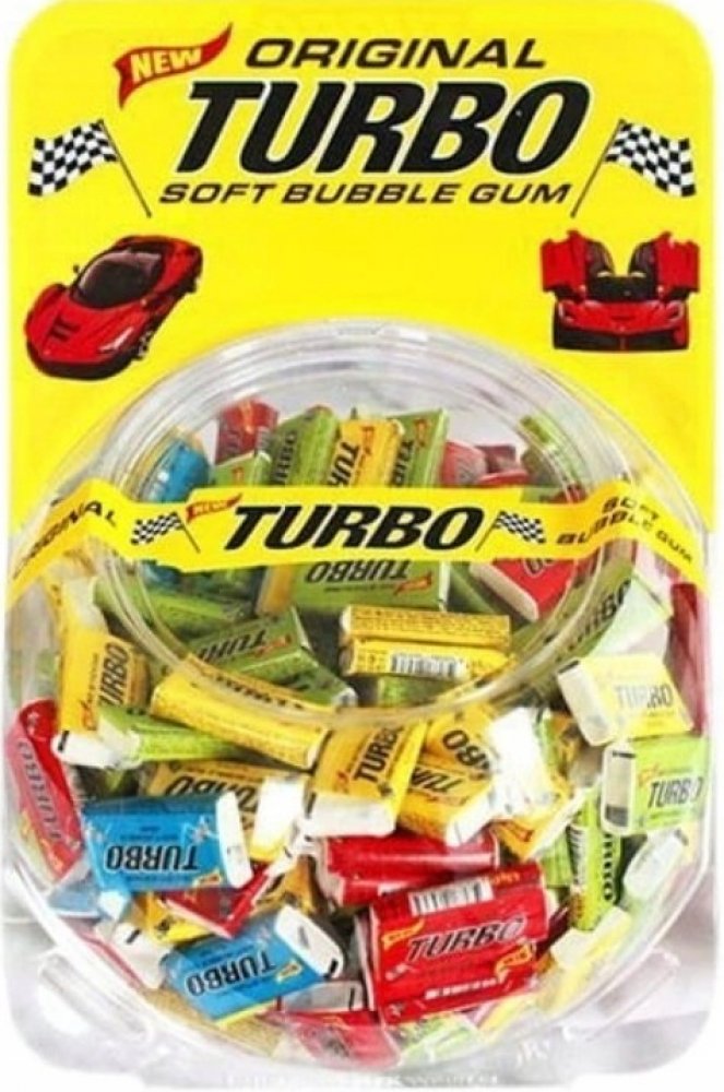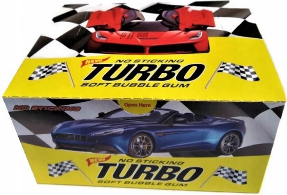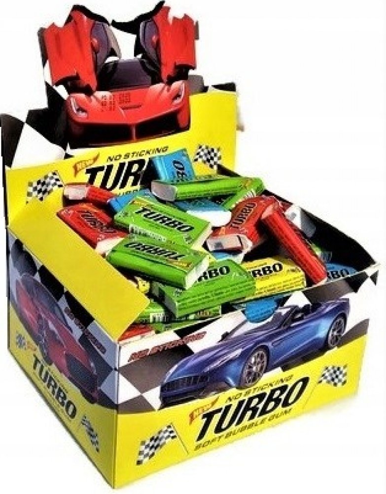 Žvýkačka TURBO 300 ks Žvýkačka s příchutí tutti-frutti a sbírkovým obrázkem auta.