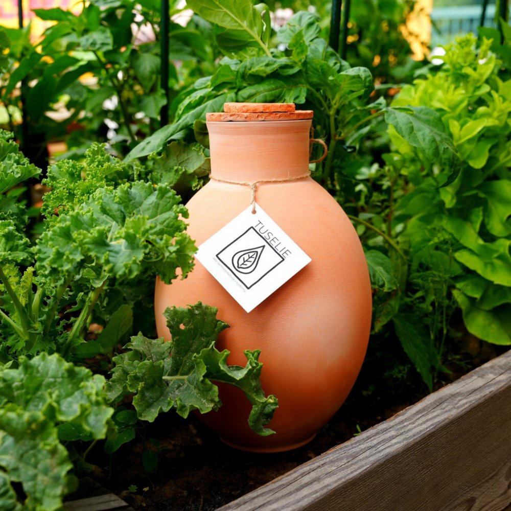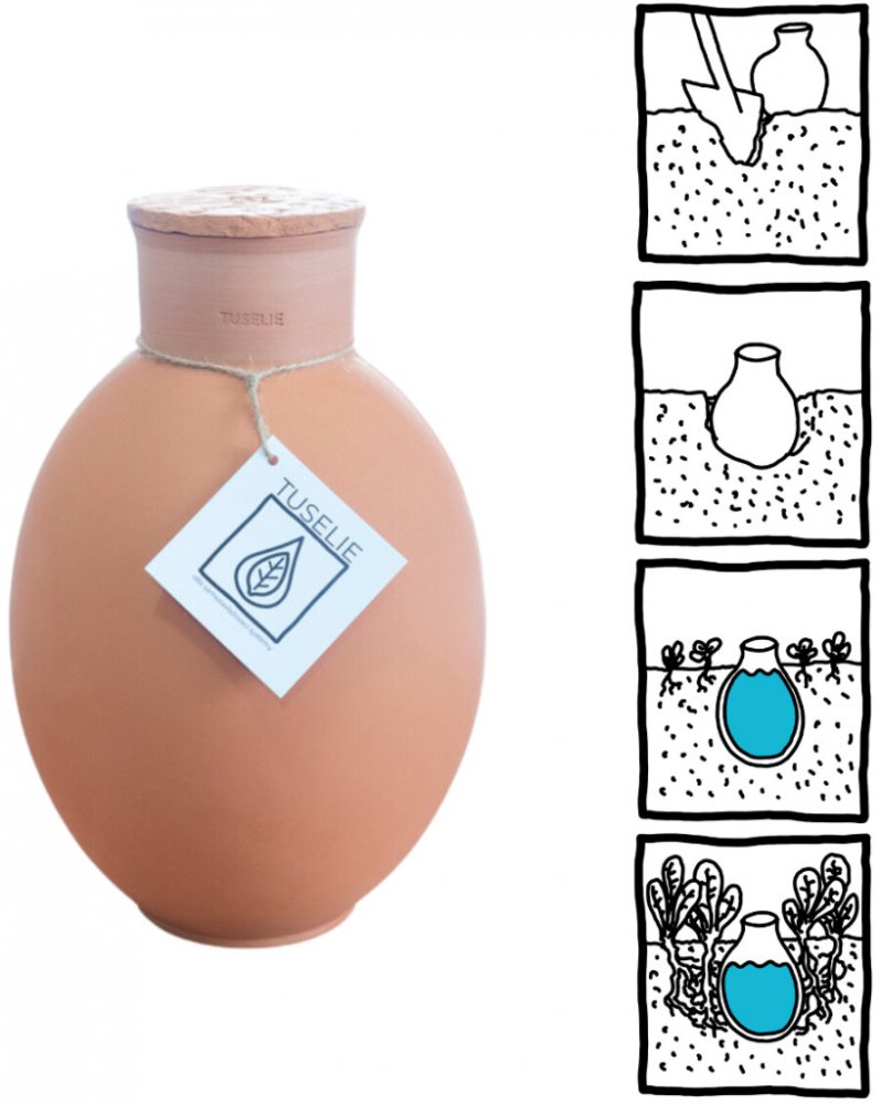 Nejúčinnější a nejúspornější způsob zavlažování. To přesně vám poskytne zavlažovací terakotová nádoba!Nejprve nádobu nainstalujte do květináče, následně naplňte vodou a sledujte, jak se vaší rostlině bude dařit. Vlhkost bude postupně prosakovat skrz stěny nádoby a dodávat tak vláhu přímo kořenům. Samotné kořeny "vycítí" zdroj vody a postupně se přichytí na stěny nádoby a budou tak čerpat vodu dle své potřeby.Už nemusíte myslet na časté zalévání. Stačí pouze čas od času zkontrolovat stav vody v zavlažovací nádobě. Navíc se stane i skvělým designovým doplňkem vaší pokojovky. Vybírat můžete i z několika barev nebo velikostí, aby perfektně ladily s květináčem nebo doplňky ve vaší domácnosti.Jak to funguje?Princip, na kterém zavlažování pomocí hliněné nádoby funguje, je velmi prostý. Děje se tak díky dvěma fyzikálním zákonitostem (kapilární vzlínání a tlak vodního sloupce) a vlastnostem použitého materiálu – hlíny. Nádoba se celým svým objemem až po své hrdlo zakope do zeminy záhonu nebo květináče a naplní vodou. Tato voda vzlíná skrze stěny nádoby do okolní zeminy a tím ji zvlhčuje. Pokud máte nádobu přímo v záhoně, rostliny vysázené v okolí nádoby cítí zdroj vody a vyvinou svůj kořenový systém směrem k ní tak, že nádobu celou svými kořeny obrostou. A potom již vlásečnicovými kořínky sají vodu přímo ze stěny nádoby. Tak vzniká kontrolovaná metoda zavlažování, při které má rostlina tolik vody, kolik potřebuje a kdy potřebuje. Jedná se o nejefektivnější způsob distribuce vody rostlinám, který se přizpůsobuje jejich potřebám. Jaké jsou výhody zavlažování pomocí hliněné nádoby? Snížení spotřeby vody nutné pro zavlažování rostlin. A to podle typu rostliny od 50 – 90% oproti klasické povrchové zálivce, při které se velké množství vody ztrácí povrchovým odparem či odtokem.Rostliny si samy řídí množství vody, kterou potřebují a čas, kdy ji potřebují, dosahujeme tím optimalizace v distribuci vody. Nehrozí tak přelití nebo uschnutí rostin.Rostliny si vyvinou větší a zdravější kořenový systém, a i díky tomu mají pak více plodů a květů.Úspora času! Doplnění vody do nádob je mnohem rychlejší než zavlažování povrchovou zálivkou konví či hadicí. Nedoplňujeme tak často, jak často bychom museli zalévat povrchovou zálivkou. Nemusíme řešit teplotu vody, kterou naléváme do nádob, neboť i když použijeme vodu studenou, než voda “dorazí” k rostlině, získá tu správnou teplotu. Kde je vhodné nádobu používat? Menší velikosti nádob doporučujeme použít k pokojovým rostlinám. Mají k tomu i přizpůsobenou zapichovací část, kudy přes terakotu může voda prosakovat do květináče. Větší velikosti nádob jsou určené k venkovnímu použití. Jsou vhodné pro každý typ záhonu, ať se jedná o klasický zahradní záhon nebo záhon vyvýšený, bylinkovou spirálu, skleník, velkoobjemové nádoby na pěstování na terase či na balkoně.Nádoba je vhodná pro všechny rostliny s rozvinutým kořenovým systémem, což je většina u nás pěstovaných užitkových rostlin.