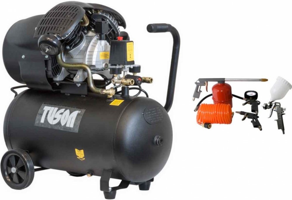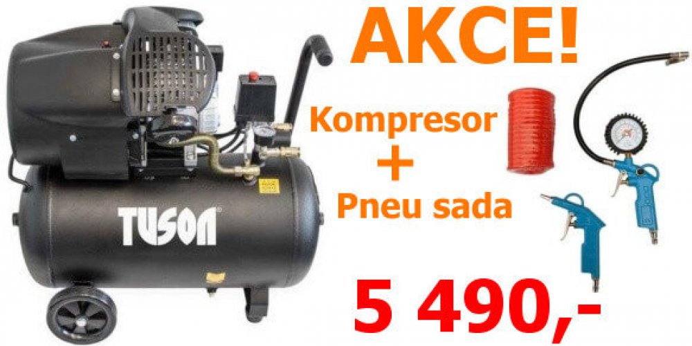TUSON - Dvoupístový olejový kompresor Pomocí kompresoru a vhodného příslušenství lze provádět např.: Čištění stlačeným vzduchem - pistole s různými tryskami. Mytí vodou, naftou, atd. - pistole na mytí. Malování - stříkací pistole. Huštění p ...