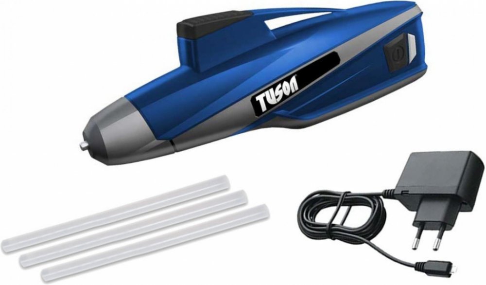 Součástí balení jsou 3ks tavných tyčinek a nabíjecí kabel.