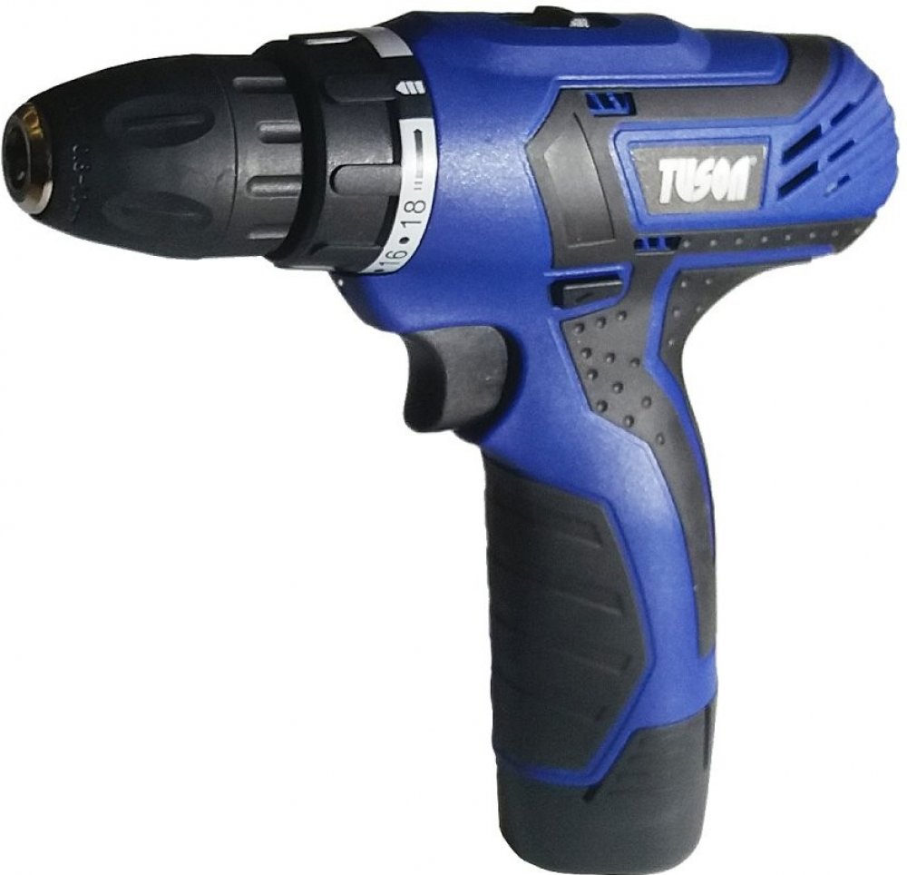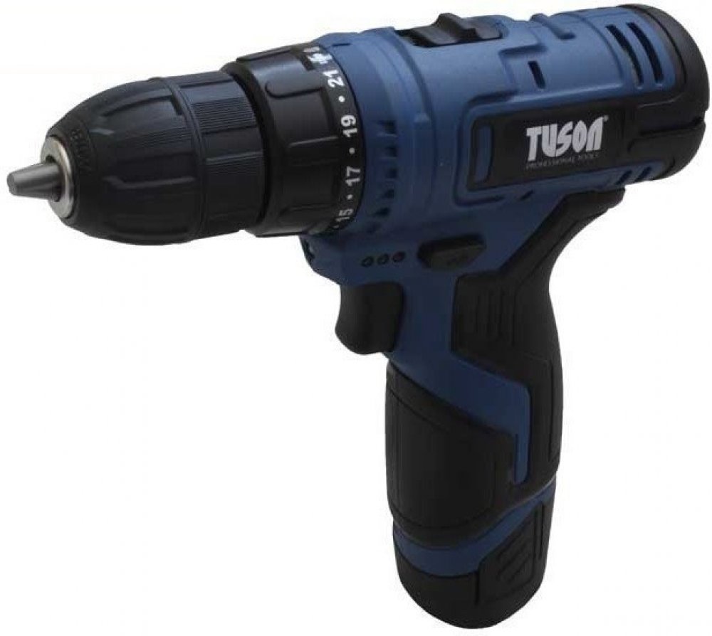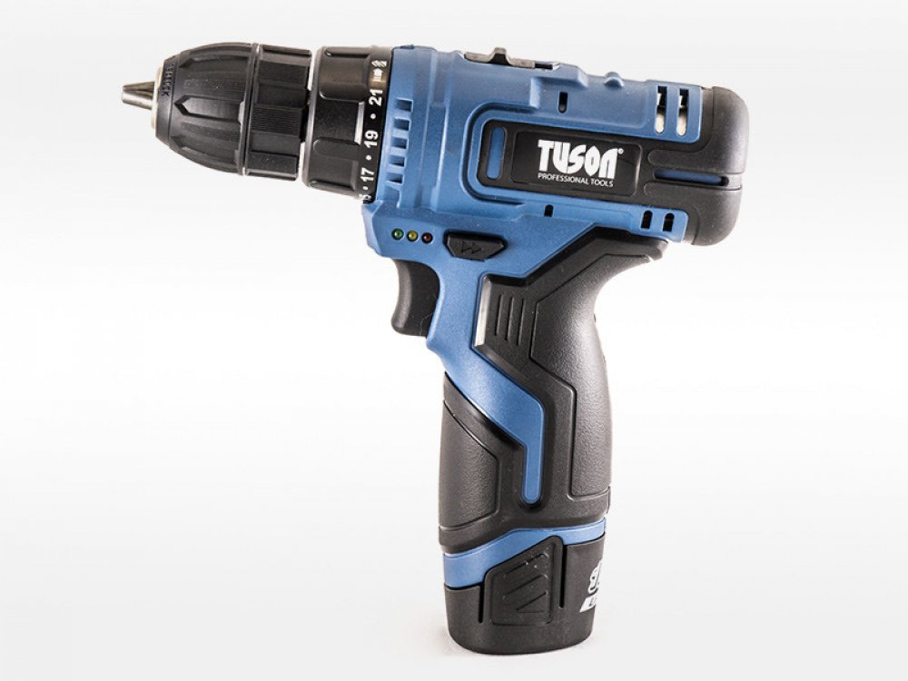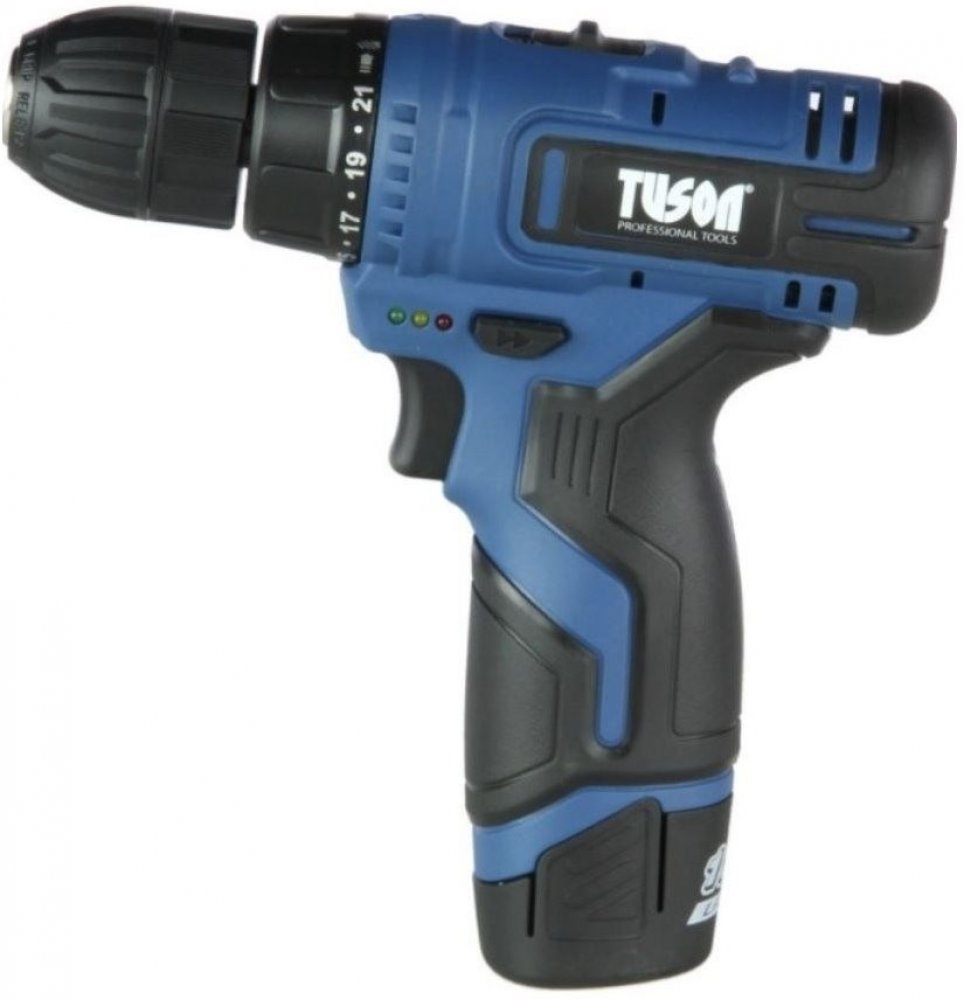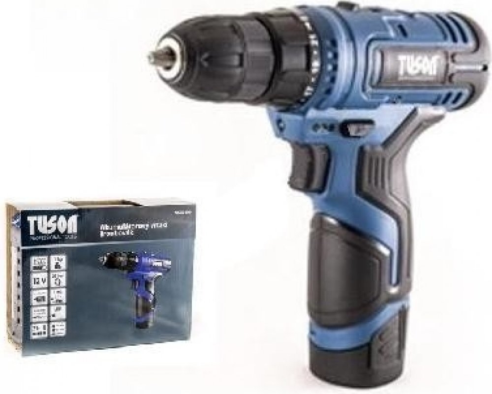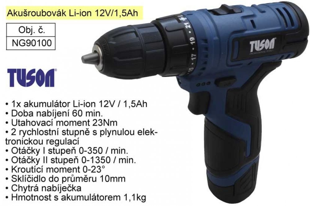 Akumulátorový vrtací šroubovák TUSON NG90100 s dvourychlostní převodovkou s plynulou elektronickou regulací, pro šroubování a vrtání do kovu a dřeva. Šroubovák má zabudovanou osvětlovací LED diodu, která osvětluje pracovní prostor a je vybaven signalizací stavu energie v akumulátoru. Výhodou Li-ion baterie je dobíjení při jakémkoliv stupni vybití bez paměťového efektu a menší rozměry a hmotnost. Šroubovák spolu s nabíječkou a baterií je dodáván v praktickém plastovém kufru.