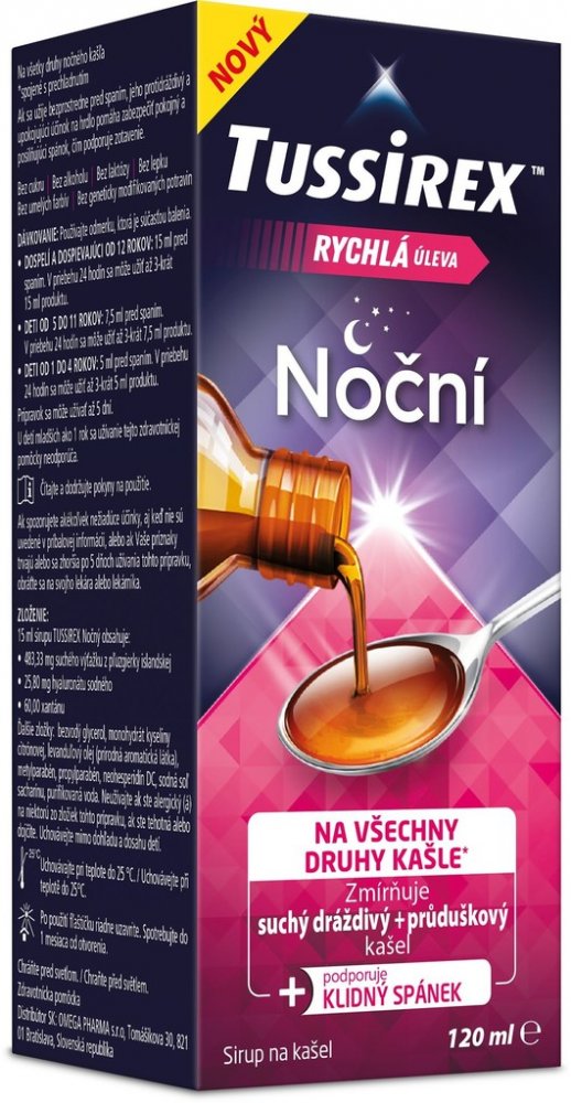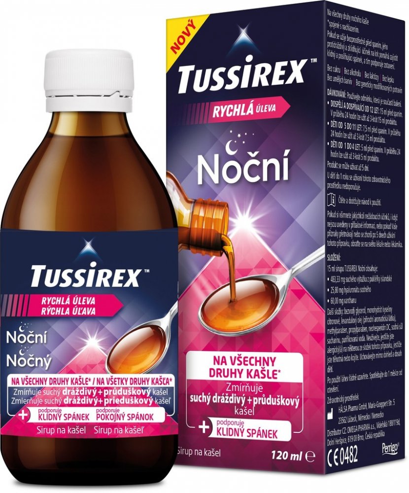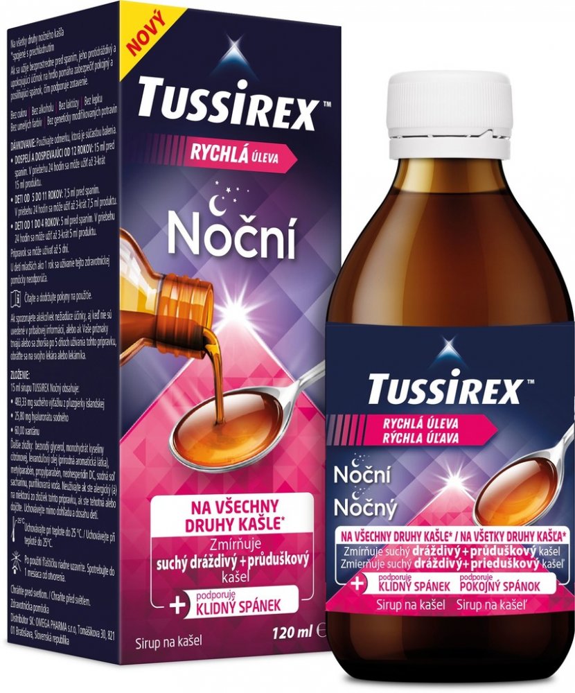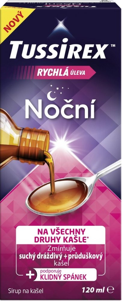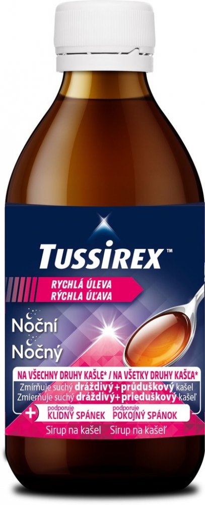 TUSSIREX Noční sirup je určený na léčbu všech druhů nočního kašle spojeného s nachlazením a také chrapotu, škrábání v krku, nutkání na odkašlání a potíží s polykáním, zejména v noci.