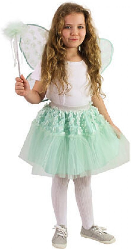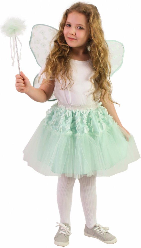 Krásná vílí sada pro malé holčičky! Sada obsahuje zelenou tylovou TUTU sukýnku se saténovou spodničkou. Sukně je zdobena drobnými květinkami a stříbrnou gumou v pase, k tomu perfektně sladěná křídla a hůlka ve stejném motivu. Sukně je dlouhá cca 35 cm a je vhodná pro obvod pasu 50-60 cm.