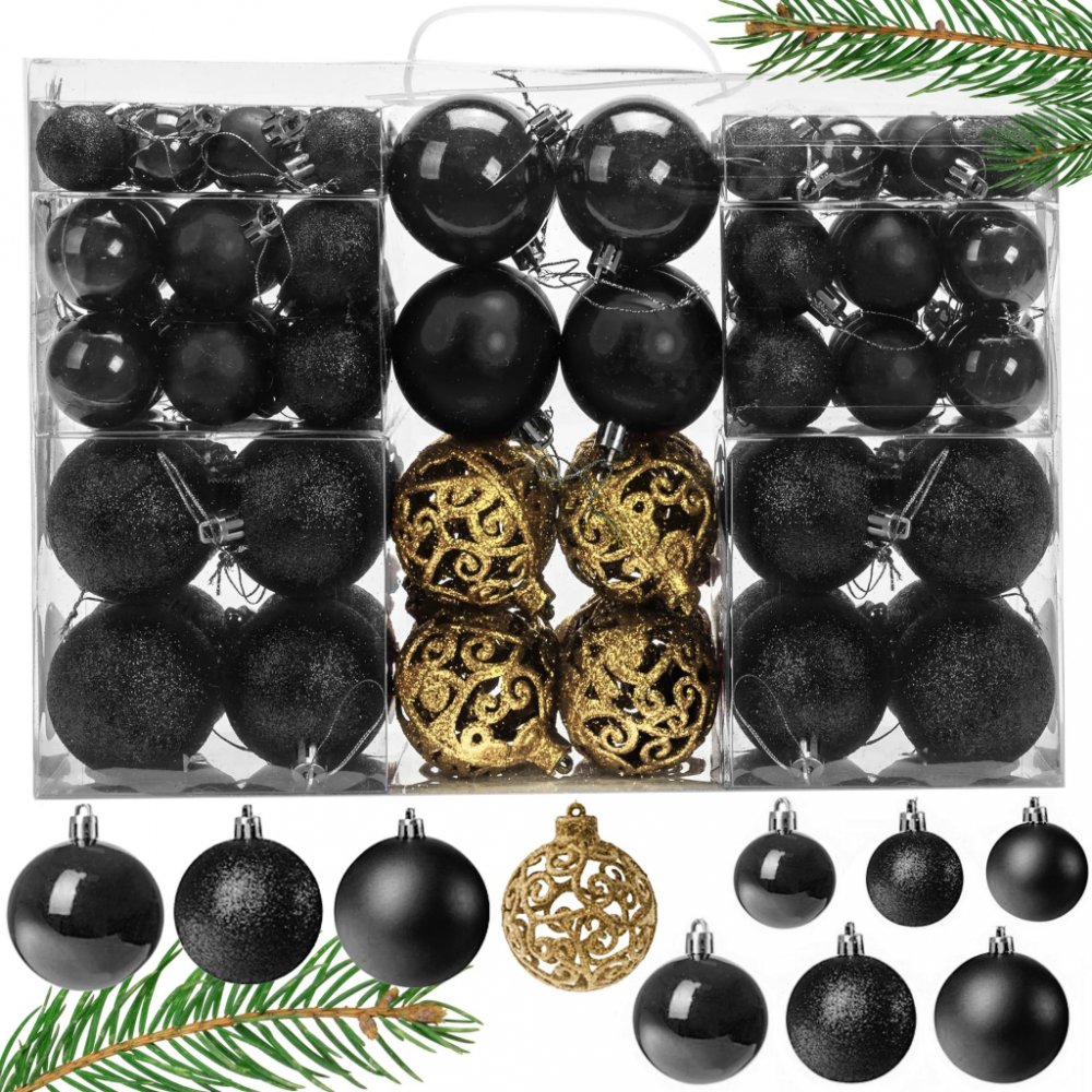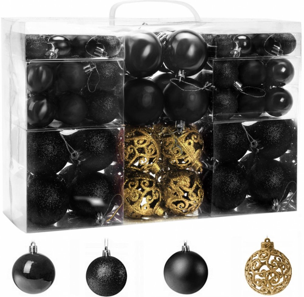 Představujeme vám sadu plastových ozdob s různými povrchovými úpravami, které zpestří váš vánoční stromeček. Baňky vypadají na vánočním stromku skvěle a jsou odolné proti rozbití, díky čemuž strávíte svátky bez obav o vánoční výzdobu. Přineste všem atmosféru vánočního kouzla.Vánoční ozdoby na stromeček jsou nezbytnou součástí výzdoby vánočního stromku, která vám umožní pocítit atmosféru a kouzlo Vánoc. Předkládaná sada obsahuje až 100 kusů, takže snadno vystačí na ozdobení standardního vánočního stromku a v kombinaci se světýlky vytvoří úžasný efekt.Baňky jsou k dispozici ve dvou barvách: černé a zlaté. Toto duo vypadá velmi vkusně, originálně a okamžitě upoutá pozornost. Kromě toho jsou černé ozdoby na vánoční stromek k dispozici v různých povrchových úpravách – od matných přes lesklé až po třpytivé. Každý z nich do sebe dokonale zapadá a vytváří harmonický celek a módní aranžmá. Zde pře