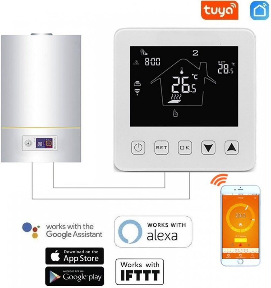 AS-HY08WW-2 = Chytrý pokojový termostat sloužící ke kontrole vytápění v domě pomocí chytrého telefonu nebo tabletu z jakéhokoliv místa díky chytré aplikaci, ovládání pomocí iOS, Android zařízení, týdenní rozvrh, nastavení teploty interiéru v rozpětí 5 až 35 °C s krokem 0,5 °C, WiFi 802.11 b/g/n, kompatibilní s Google Assistant a Amazon Alexa, snižuje náklady na energii a stopu na životním prostř...