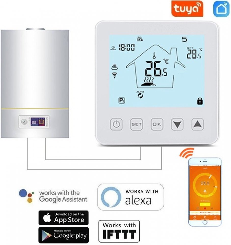 AS-HY08WW-4 = Chytrý pokojový termostat sloužící ke kontrole vytápění v domě pomocí chytrého telefonu nebo tabletu z jakéhokoliv místa díky chytré aplikaci, ovládání pomocí iOS, Android zařízení, týdenní rozvrh, nastavení teploty interiéru v rozpětí 5 až 35 °C s krokem 0,5 °C, WiFi 802.11 b/g/n, kompatibilní s Google Assistant a Amazon Alexa, snižuje náklady na energii a stopu na životním prostř...