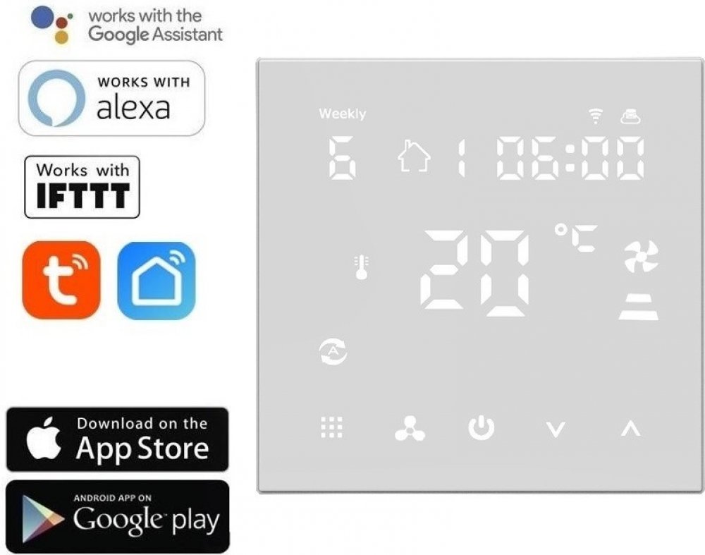 AS-HY607AC = Chytrý termostat, který je určen pro ovládání klimatizace a fan coilů (topný režim, chladící režim, režim větrání) pomocí chytrého telefonu nebo tabletu z jakéhokoliv místa díky chytré aplikaci, ovládání pomocí iOS, Android zařízení, regulátor prostorové teploty pro dvou a čtyřtrubkové fan-coily, moderní nadčasový design, týdenní rozvrh, nastavení teploty interiéru v rozpětí 5 až 35 °C s krokem 0,5 °C, WiFi 802.11 b/g/n, kompatibilní s Google Assistant a Amazon Alexa, snižuje náklady na energii a stopu na životním prostředí.