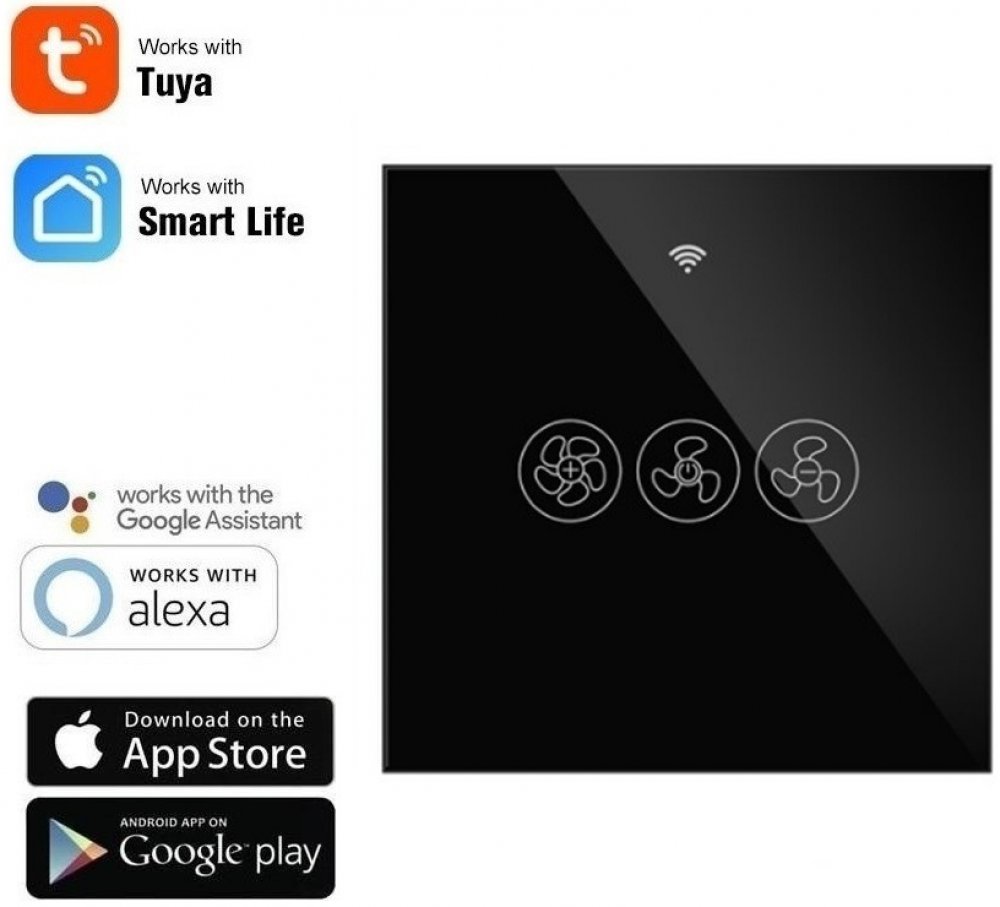 AS-WS-EU-F = WiFi + RF chytrý dotykový regulátor otáček pro ventilátor třítlačítkový, vestavný, pro regulaci otáček pro ventilátor přes WiFi, funguje bez řídicí jednotky, RF433MHz - možnost ovládání pomocí dálkového ovladače-klíčenky, kompatibilní s Amazon Alexa a Google Assistant, ovládání pomocí aplikace v českém jazyce pro Android/iOS, skleněný povrch, rozměry: 86x86x34cm, barva: černá.