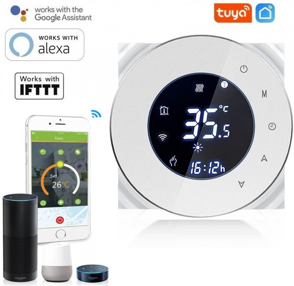 AS-6000B / 16A = Chytrý pokojový termostat sloužící ke kontrole vytápění v domě pomocí chytrého telefonu nebo tabletu z jakéhokoliv místa díky chytré aplikaci, ovládání pomocí iOS, Android zařízení, týdenní rozvrh, nastavení teploty interiéru v rozpětí 5 až 35 °C s krokem 0,5 °C, WiFi 802.11 b/g/n, kompatibilní s Google Assistant a Amazon Alexa, snižuje náklady na energii a stopu na životním pros...