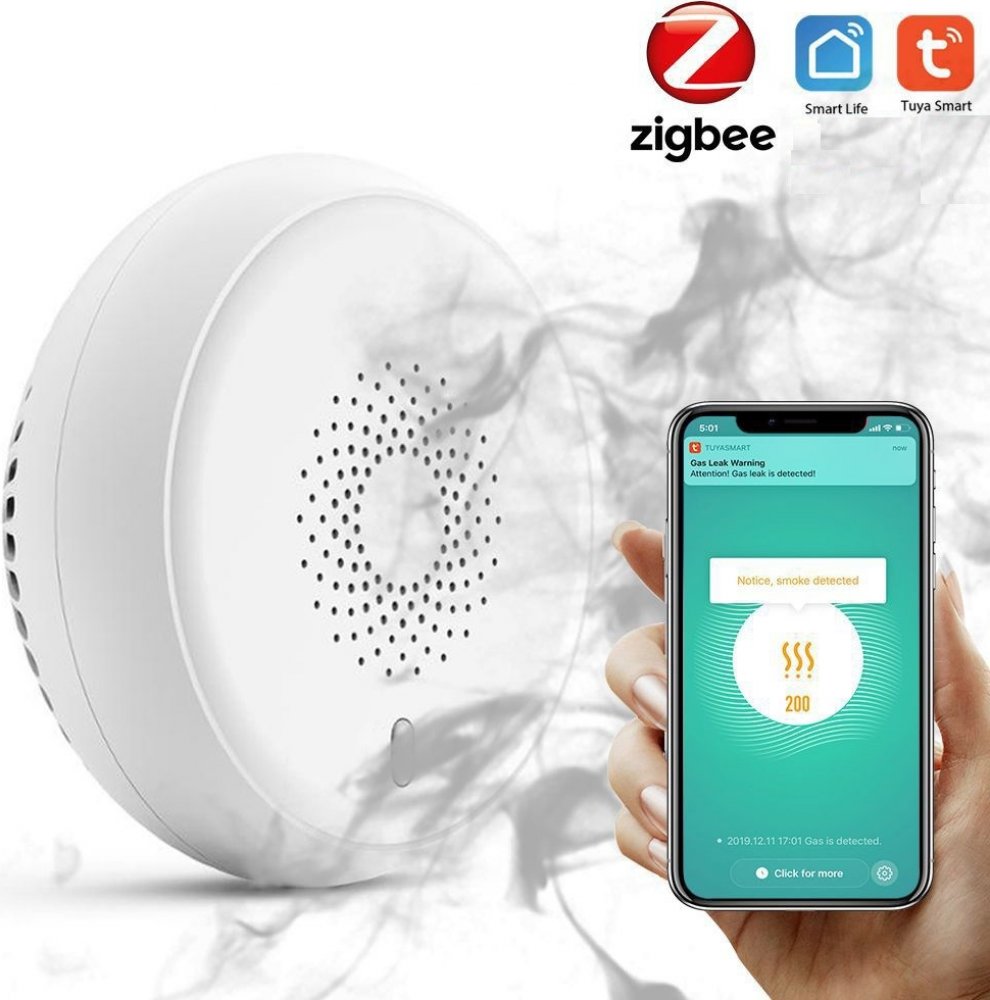 AS-MIR-SM100 = Bezdrátový kouřový senzor, připojení přes protokol Zigbee 3.0, upozornění na nízký stav baterie / Tamper-alarm / notifikace do mobilního telefonu přes aplikaci TUYA, podporované OS: Android/iOS, snadná instalace, napájeno baterií (součást balení).