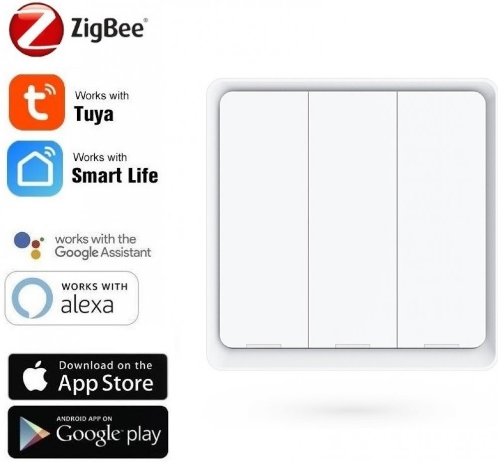AS-SF31Z-L = Spínač osvětlení třítlačítkový, vestavný, pro zapínání a vypínání osvětlení, připojení přes protokol Zigbee 3.0, kompatibilní s Amazon Alexa a Google Assistant, IFTTT, ovládání pomocí chytré aplikace TUYA, podporované OS: Android/iOS, rozměry: 86x86x34cm.