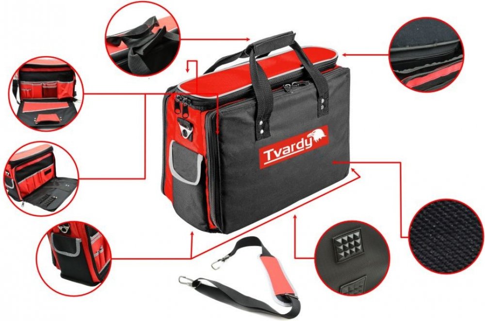 Tato kvalitní taška na nářadí disponuje hlavním dílem s polstrovanou kapsou, do které se mimo jiné vejde i notebook. Taška má také dvě boční přihrádky vybavené držáky na šroubováky a kombinované klíče a menší a větší kapsy na nářadí a příslušenství. Uvnitř je kapsa na doklady se zavíráním na zip, na bocích dvě kapsy uzavíratelné suchým zipem a ramenní p...
