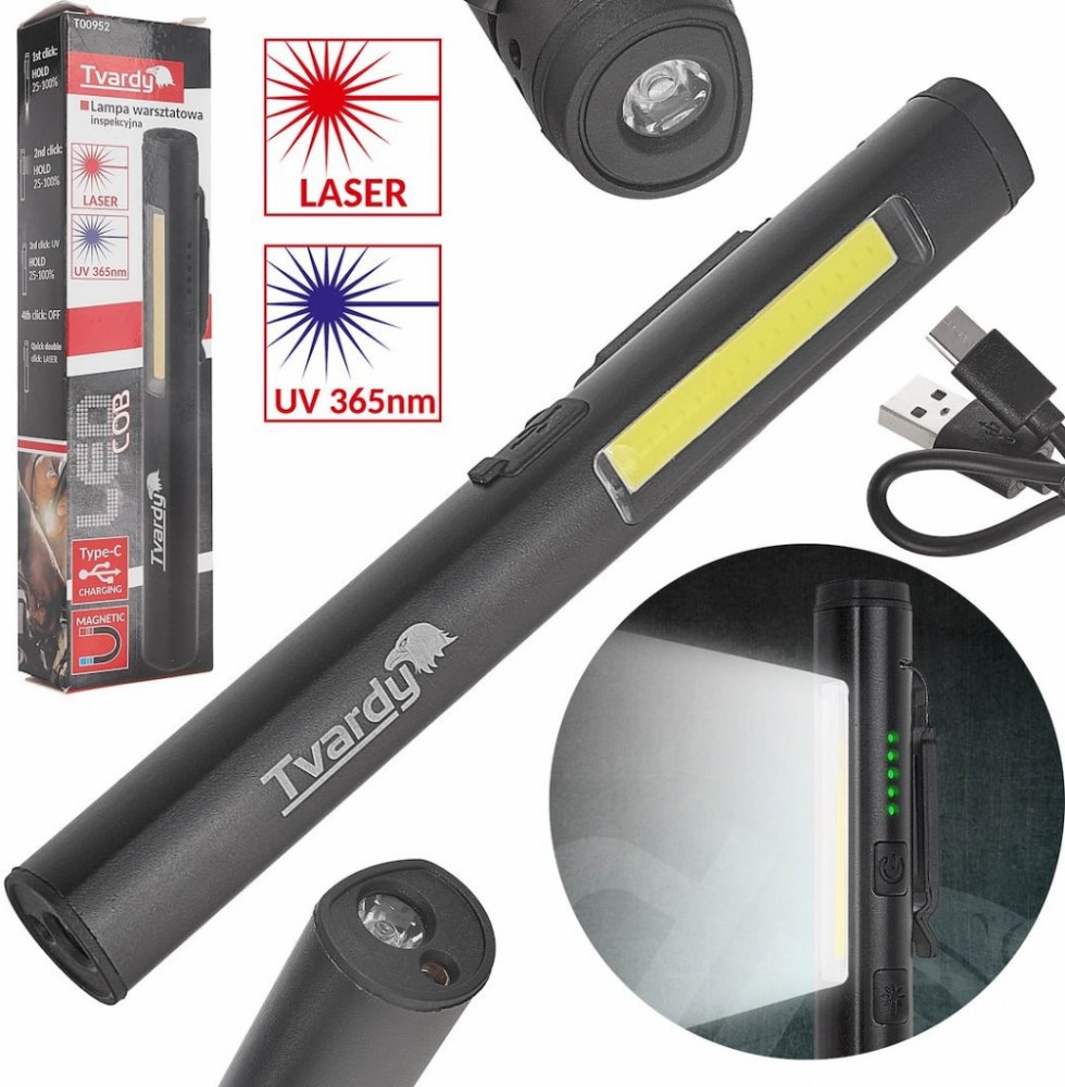 LED svítilna 400 lm, 800 mAh, UV světlo, laserové ukazovátko, magnet - TVARDYModerní inspekční svítilna představuje všestranný nástroj poskytující nepostradatelnou podporu při práci v dílně, garáži nebo během venkovních aktivit. Díky inovativnímu designu a multifunkčním možnostem se stává nezbytnou součástí profesionálního i hobby vybavení.Klíčové vlastnosti: Svítilna disponuje vysoce kvalitními L...