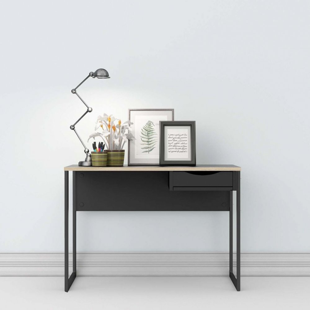 Barva: Černá matná / dub Dopravnía dodací údaje: Dodání balíkemStav dodání: V demontu, v krabiciMateriál: Imitace dřeva s dekorativní fóliíDetaily výrobku: Psací stůl - 1 zásuvkaRozměry: 110 x 48,4 x 76,5 cm (ŠxHxV) Pokyny pro údržbu: Nepoužívejte čisticí prostředky obsahující rozpouštědla nebo abrazivní čisticí prostředky Praktický černý psací stůl se zásuvkou ze série Function je vyrobený z lami...