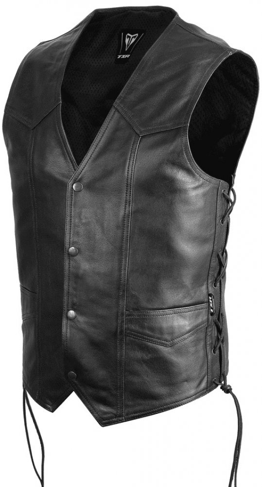 Kožená vesta na motorku TXR Road si Vás získá svou hovězí kůží o síle 1,1 - 1,2 mm. Její mesh podšívka ze 100% polyesteru Vám zaručí ideální cirkulaci vzduchu. Zapínání pomocí 4 druků. Vesta má 2 vnější a 2 vnitřní kapsy. Stylové šněrování na bocích poslouží pro snadnou regulaci velikosti.