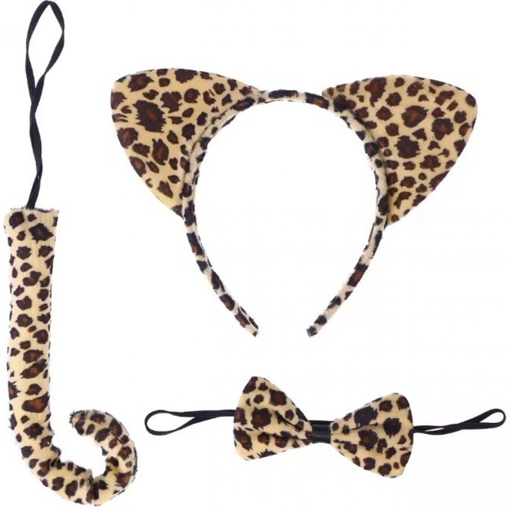 Balení obsahuje: hnědou sukni, čelenku s oušky, motýlek, čenich a ocas s leopardím vzorem