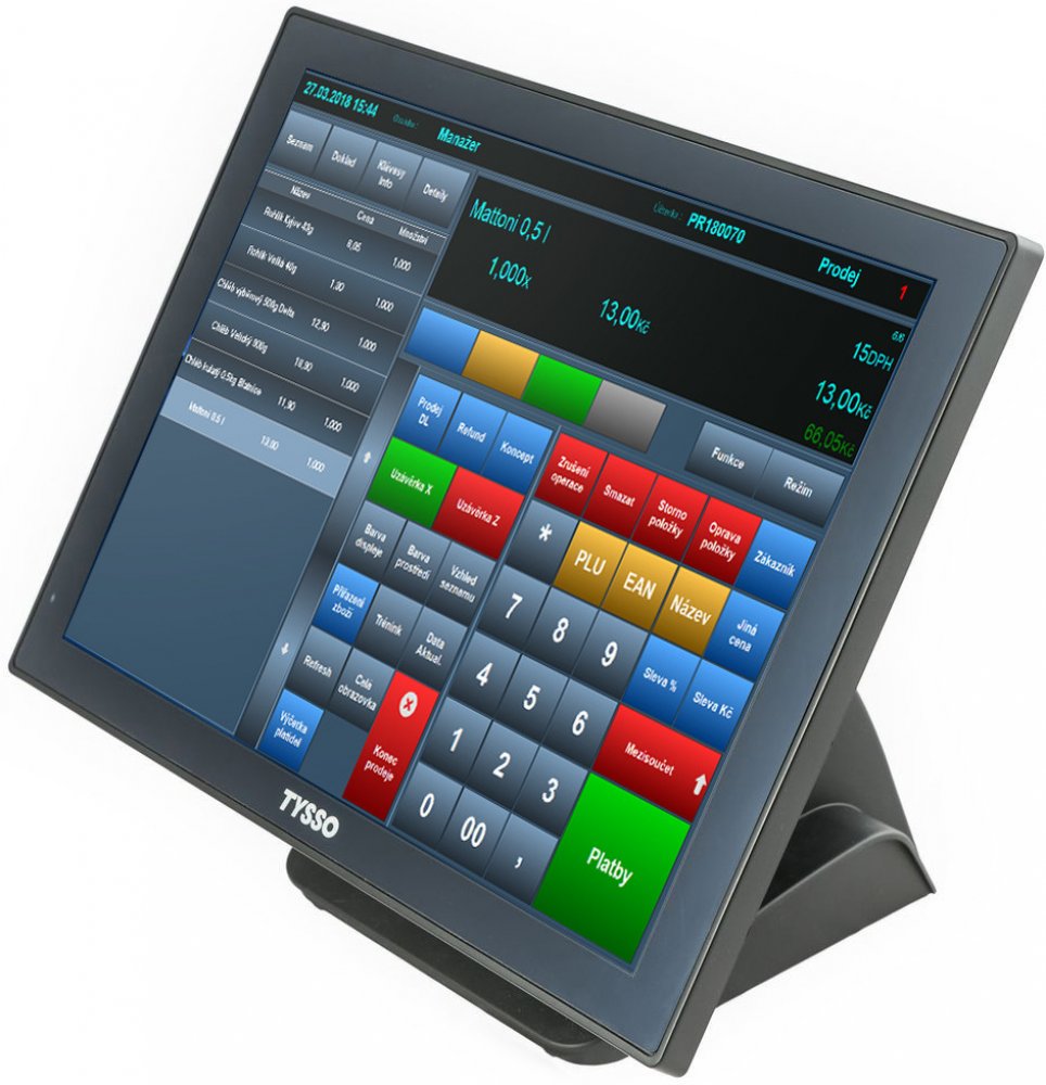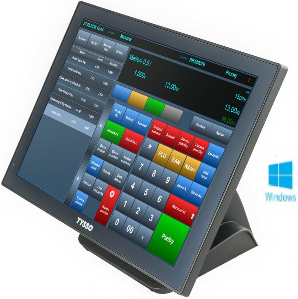 Dotykový pokladní All-in-One terminál Tysso POS-1000-B s kapacitní dotykovou plochou, rychlým SSD diskem a MS Windows 10 IoT Enterprise.