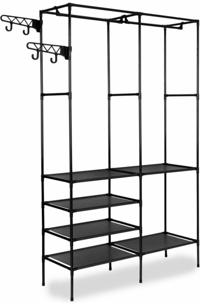 Ocelové trubky s černým práškovým nástřikem jsou k sobě pevně spojené plastovými konektory, a tak je konstrukce skříně velice stabilní a pevná. Šatní skříň má šest polic, které jsou vyrobené z voděodolného laminovaného materiálu. Tento materiál je pevný a lze ho velice snadno udržovat v čistotě. Police jsou vhodné pro uložení oblečení, bot, ručníků či ložního prádla.