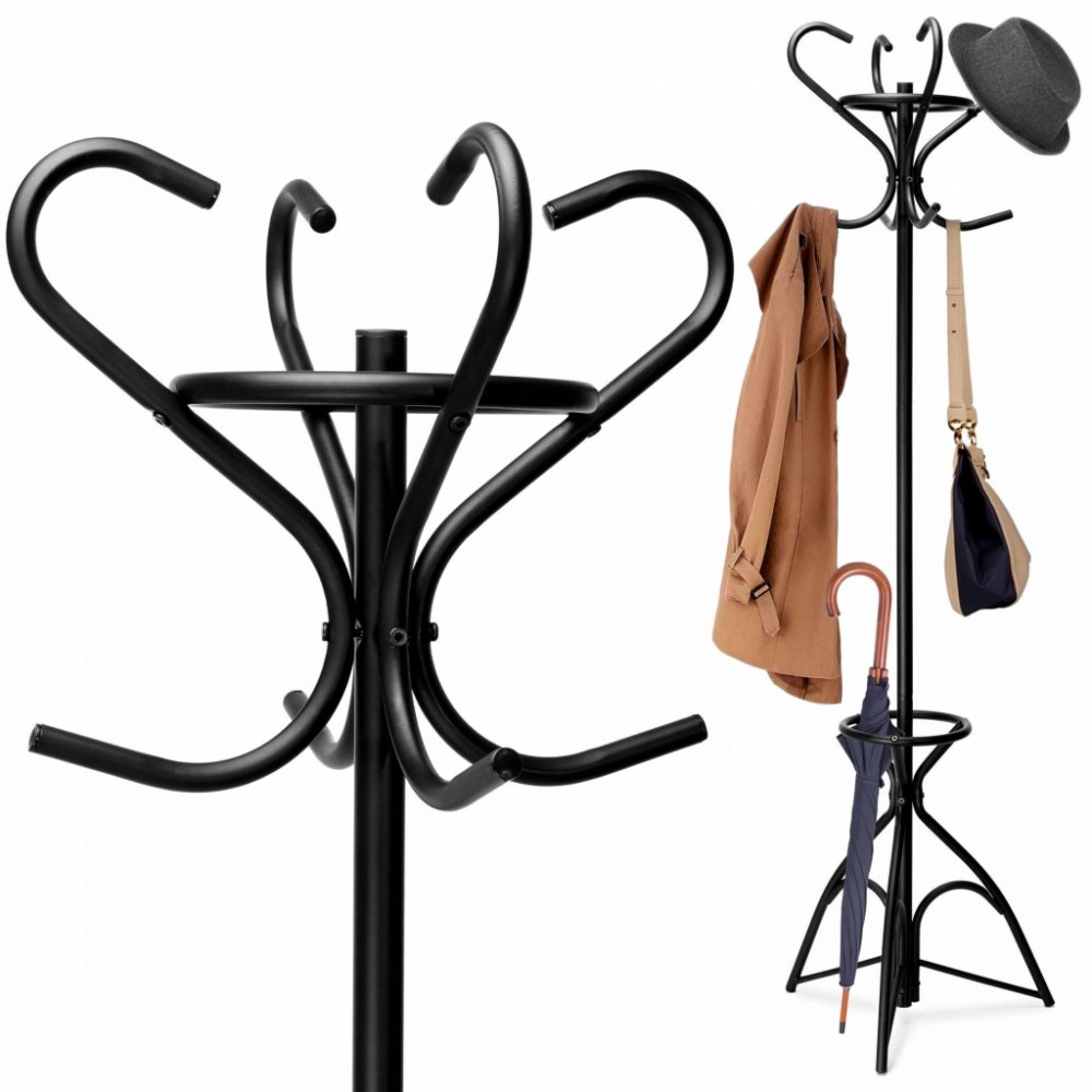 ✅Dodatečné funkce: Kromě hlavní konstrukce je věšák vybaven držákem na deštníky a dodatečnými podpěrami u nohou, které zvyšují jeho stabilitu.
